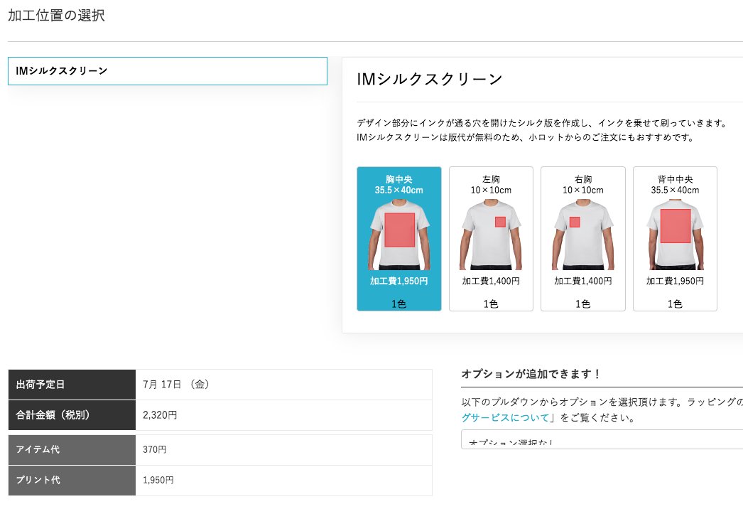 スクリーン印刷でTシャツプリント、なんと製版代が0円! プリント代も高くない……。新しい製版方法で時間とコストを1/10以下におさえることに成功ってあるけどどんな製版方法なのだ。1枚だと2320円、10枚だと単価670円ってすごいな。どんな印刷仕上がりか試してみる!