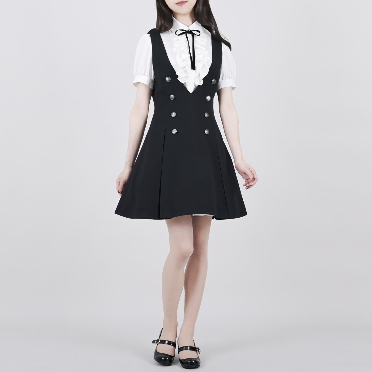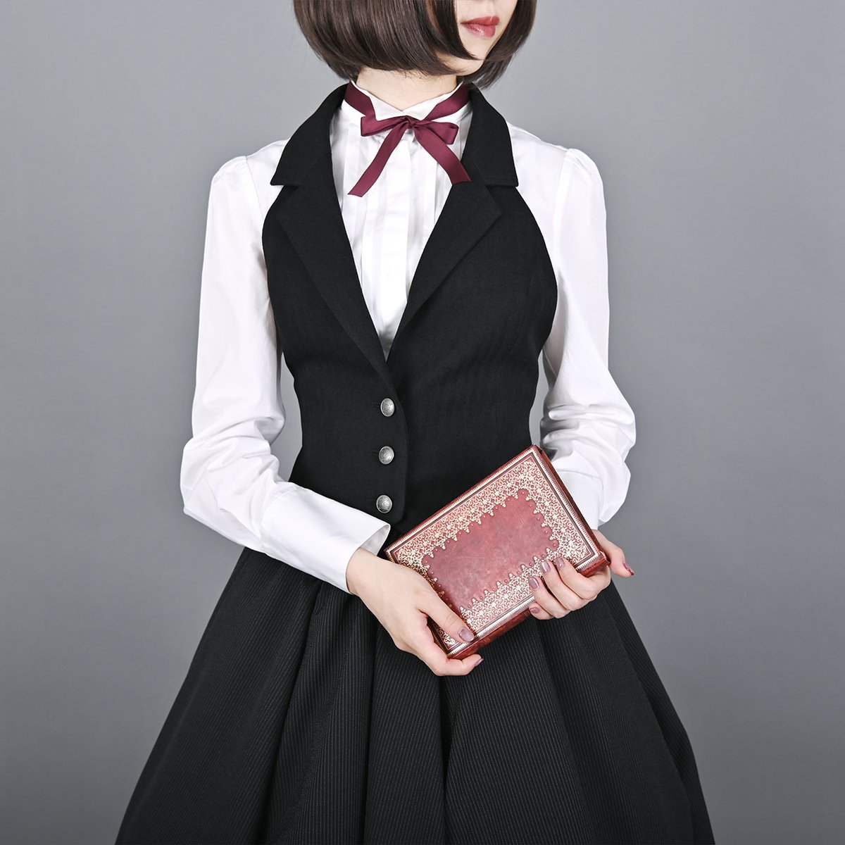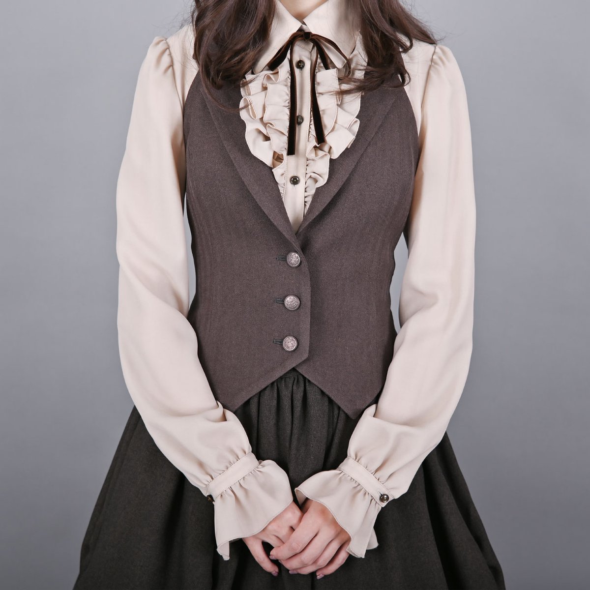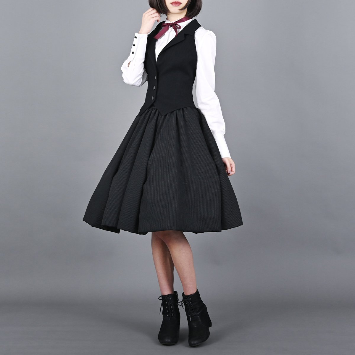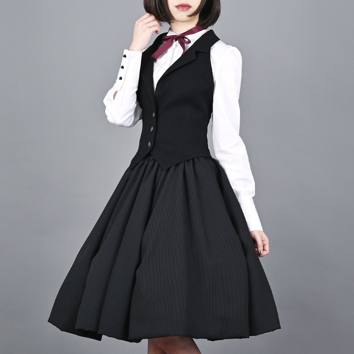 胸元にリボンを結んで、クラシカルなコーディネートにもオススメです。