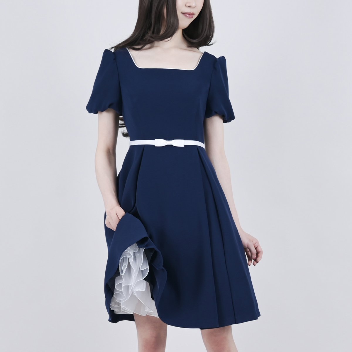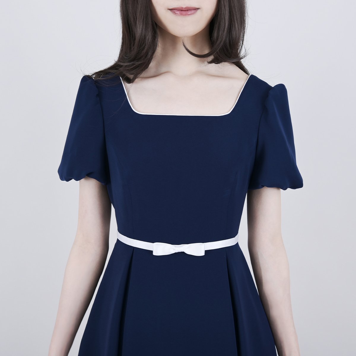 襟元は程良いスクエアネック開きなので、涼し気でありながらもしっかりと綺麗に胸元を押さえ上品見えを叶えました。
