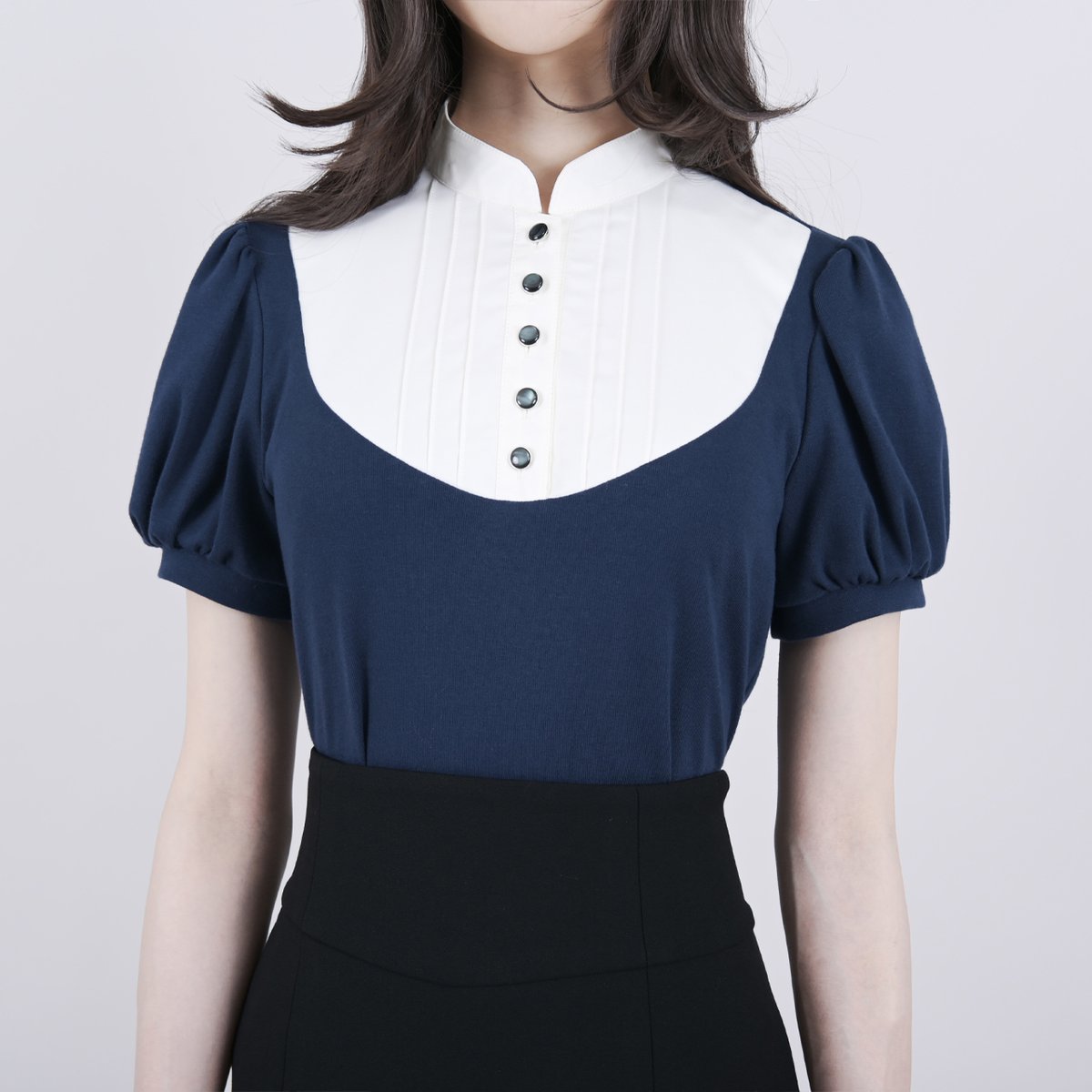 暑い夏も淑やかにお召しいただける、パウダータッチの生地が肌触りのよいブラウス。