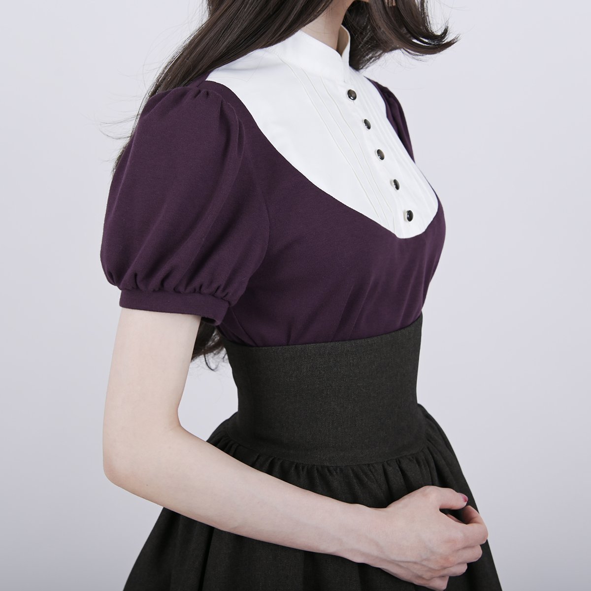 襟元はシンプルなスタンドカラーにすることで大人っぽく上品な印象に仕上がりました。