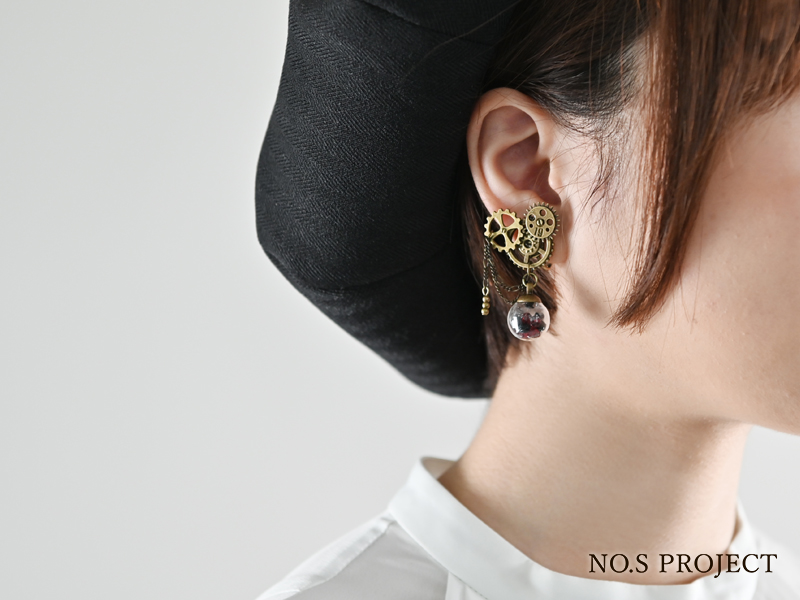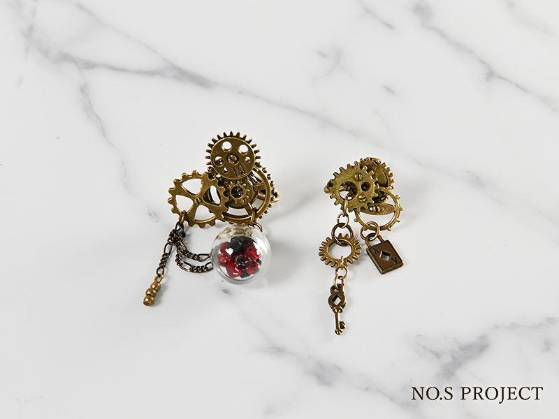 アンティークな歯車を組み合わせた、右耳から左耳へ物語を紡ぐアシンメトリーな耳飾り。