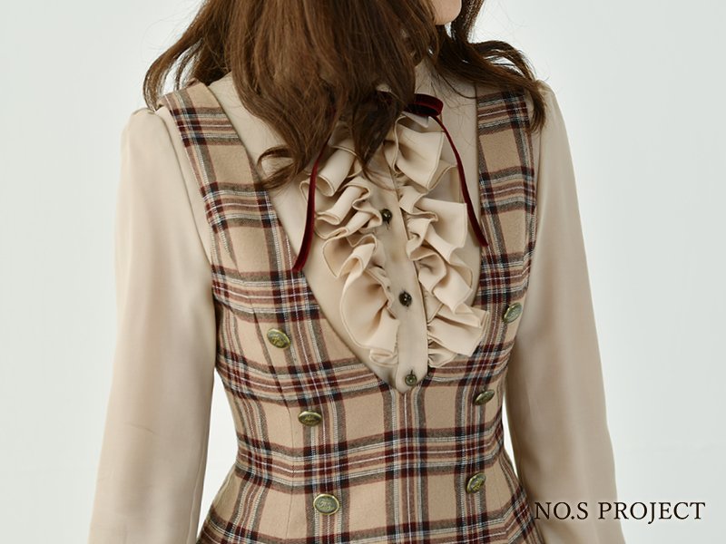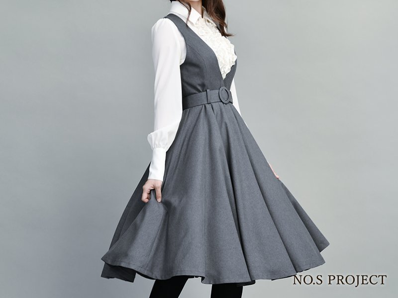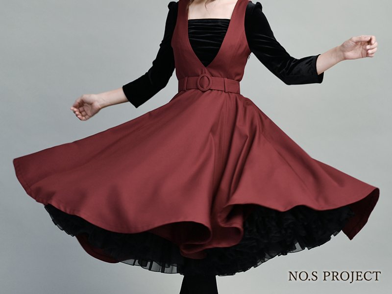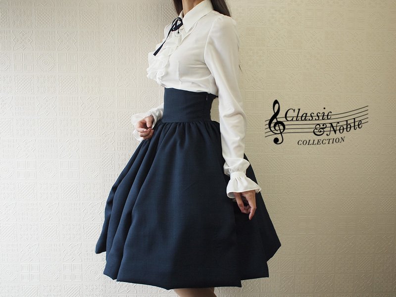 仕様と縫製テクニックで技巧を凝らし、蹴回したっぷりのスカートは座った時に円形にふわっと広がる憧れのシルエット。ハイウエストにバイオリンのf字孔モチーフの飾りを。しっとりと落ち着いたカラーでクラシックな装い。