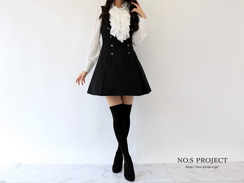 スタイルアップ効果抜群のミニワンピースと甘すぎない高貴なフリルブラウスを併せて、ワンランク上のお姉様なコーディネート。