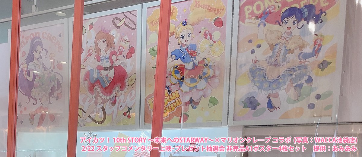 2/22開催『アイカツ! 10th STORY ~未来へのSTARWAY~』スタッフコメンタリー上映で実施予定の🎁抽選会🎁で当たるポンポンクレープ非売品ポスター4枚セット(提供:あみあみ様)はこちら!コラボ店舗でご覧になった方も多いのでは…?!