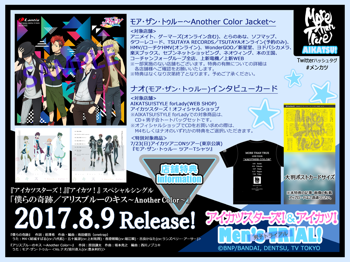 【#メンカツ!】8/9発売のアイカツ!シリーズの男子たちによるCD「僕らの奇跡/アリスブルーのキス~AnotherColor~」の、対象店舗購入特典“モア・ザン・トゥルー~AnotherColorJacket~”の絵柄が決定♪予約での購入限定のお店もありますのでまだの方はぜひ☆