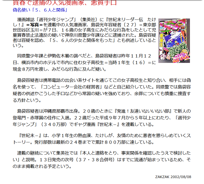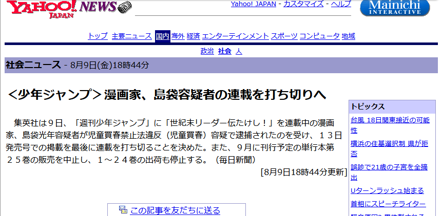 『たけし』のときは、8月7日に逮捕されて、8月9日に連載終了を発表