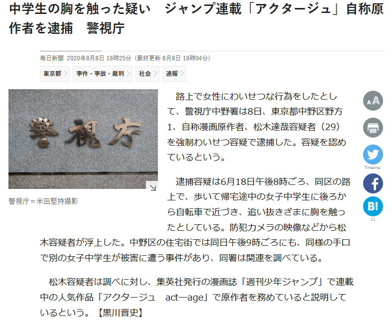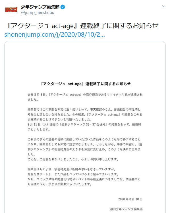 『アクタージュ』も、8月8日に逮捕されて、8月10日に連載終了を発表
