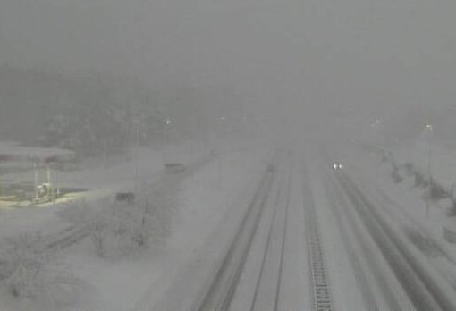 現在の中央自動車道 内津峠PA付近です。雪がかなり強まっておりますので、冬用タイヤを装着して十分に注意して走行ください。