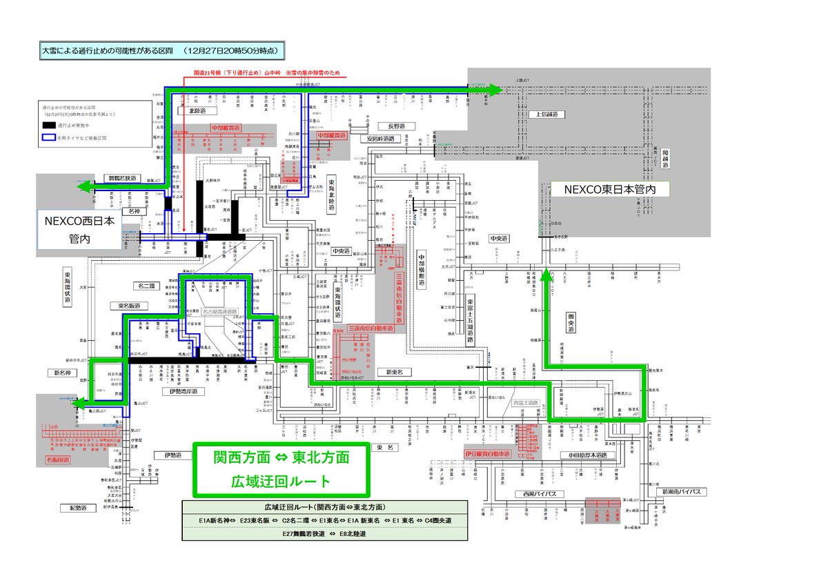 不要不急の外出を控え、やむを得ず高速道路ご利用される際には冬用タイヤの装着とタイヤチェーンの携行をお願いします。最新の交通情報⇒c-ihighway.jp/pcsite/map?are…