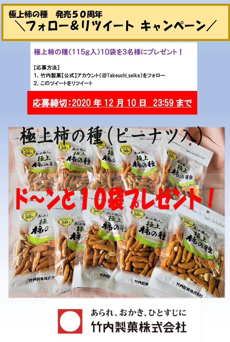 極上柿の種の発売50周年を記念して『極上柿の種(115g)入×10袋』を抽選で3名様にプレゼントさせて頂きます