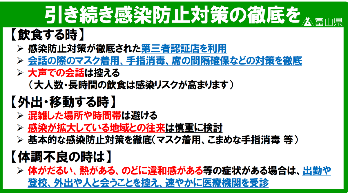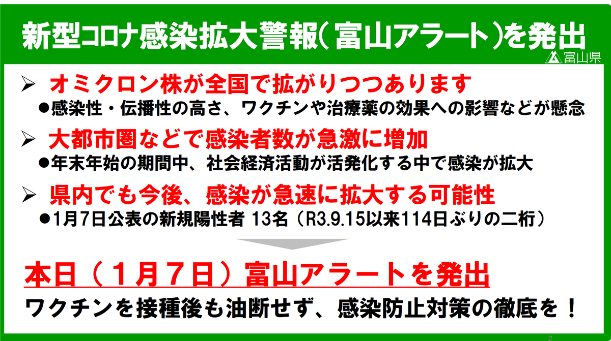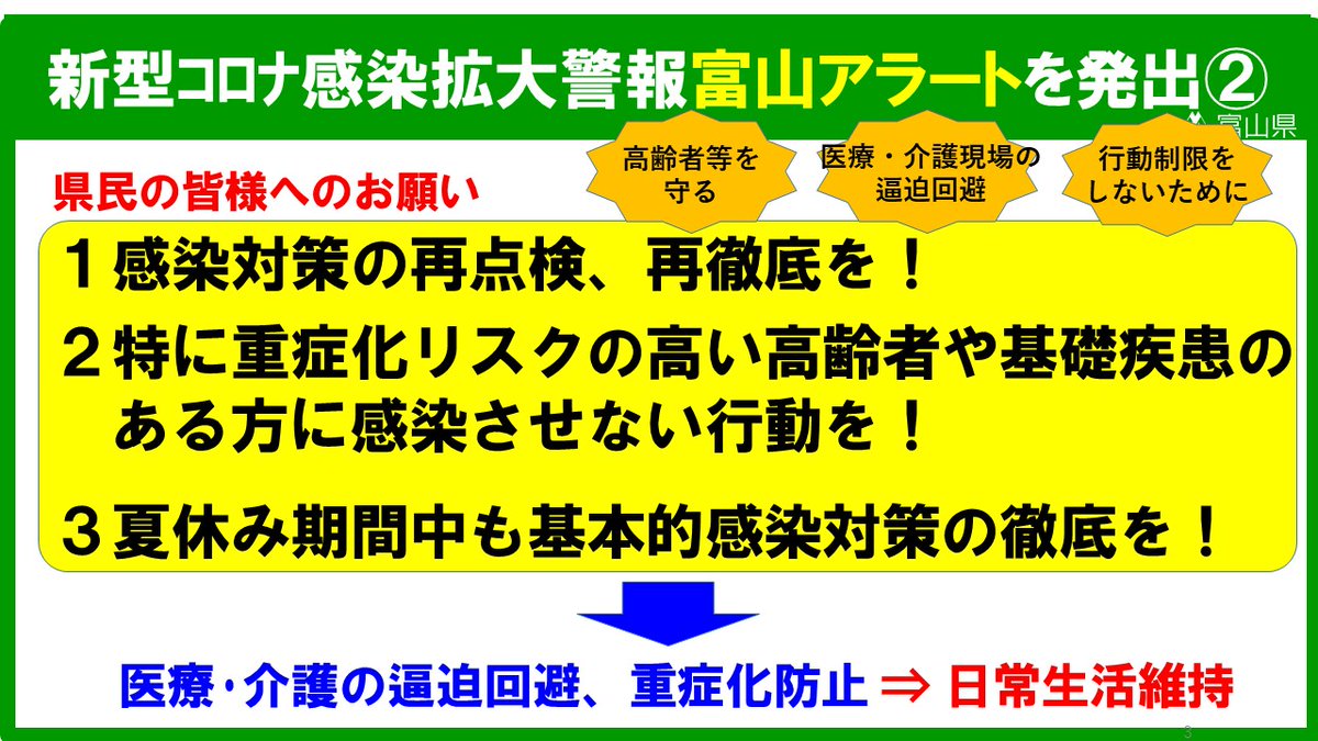 新型コロナウイルスの感染が急拡大していることを踏まえ、令和4年7月27日から8月9日までを期限として、富山アラートを発出します🚨
