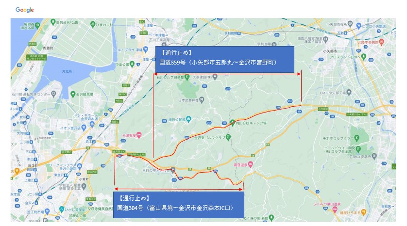 集中除雪のため、国道359号(小矢部市五郎丸~金沢市宮野町)、国道304号(石川県)で通行止めを実施しています。