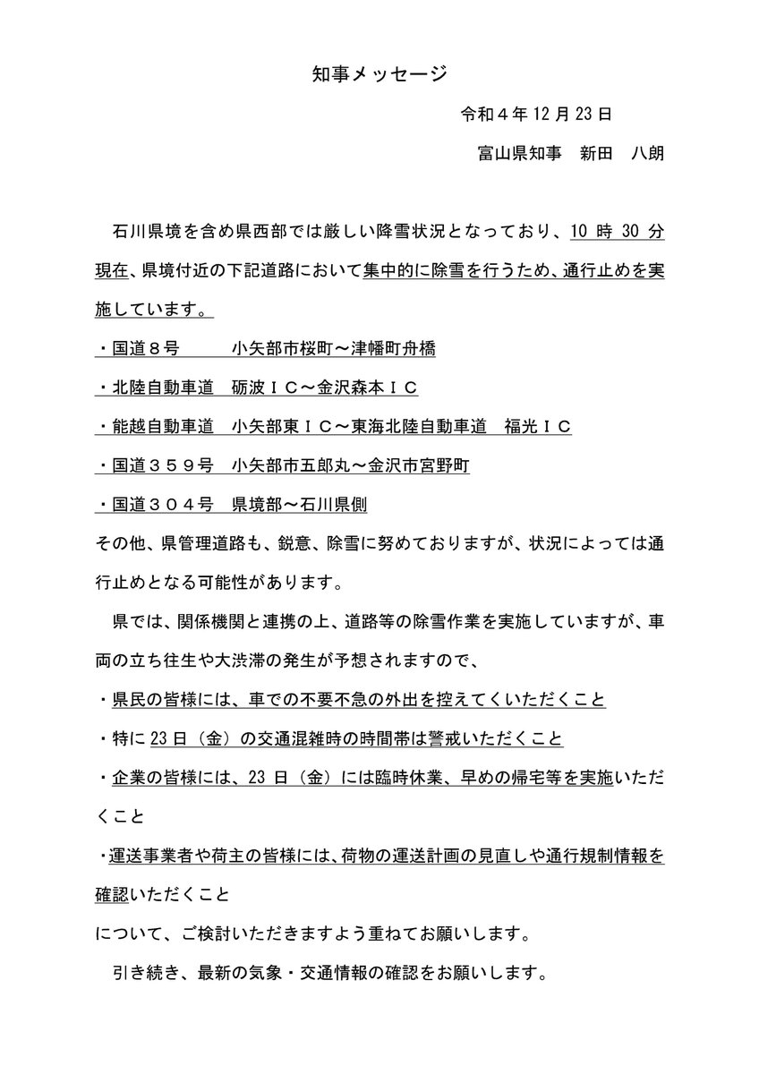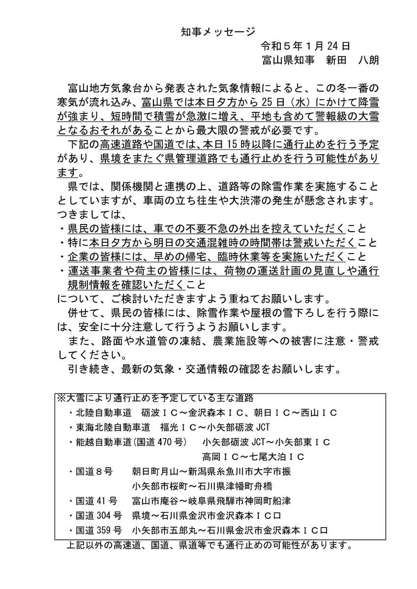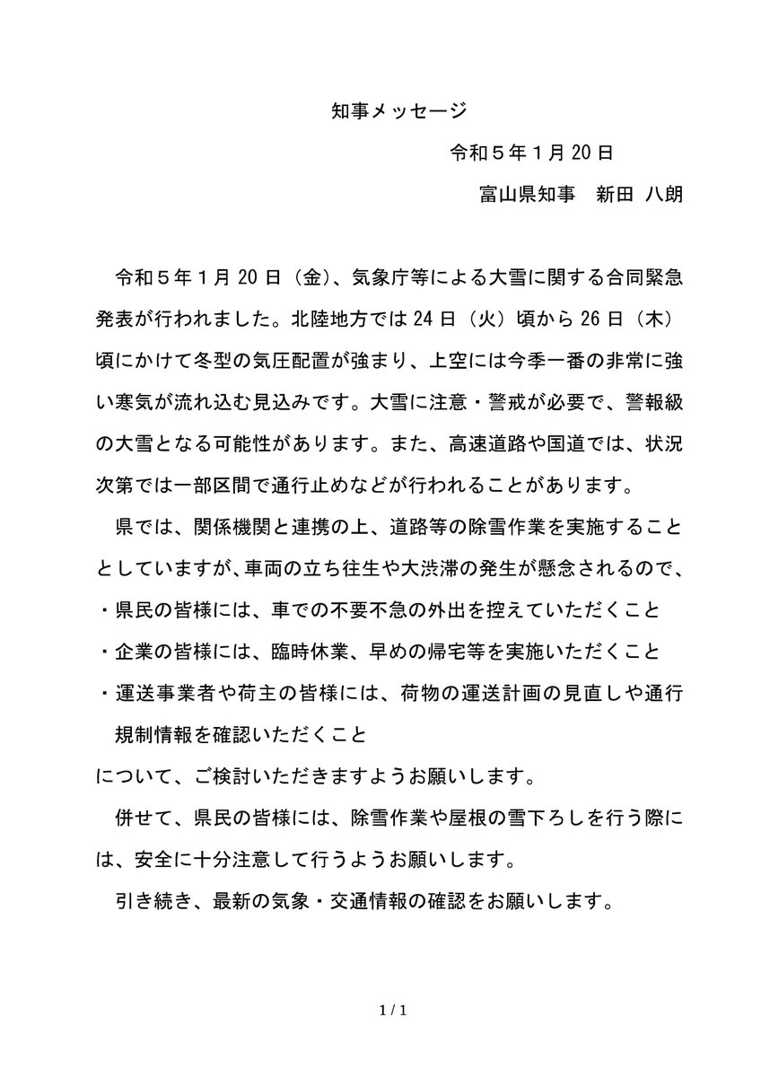 大雪に関する知事メッセージを発出しました。