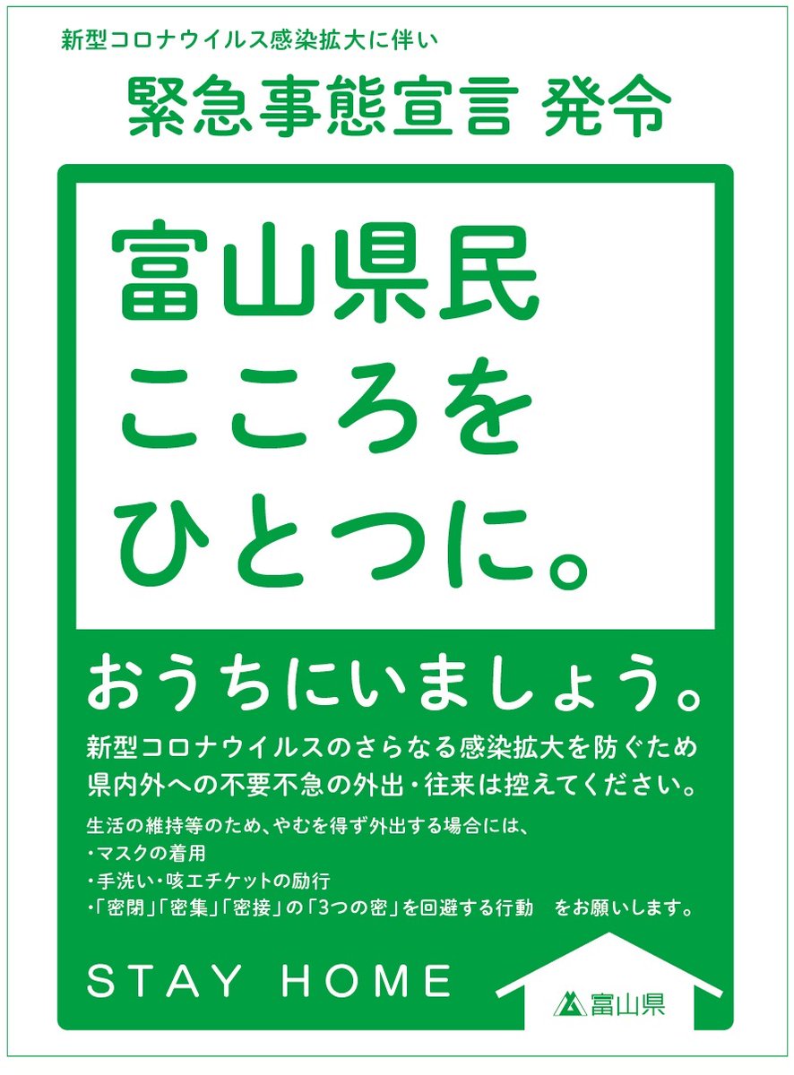 新型コロナウイルス感染症の全国的な拡大に伴い、国が4月16日に緊急事態宣言の対象地域を全都道府県に拡大したことを受け、本県では、以下のとおり「富山県の緊急事態措置」を発表しました。(2020.4.17)