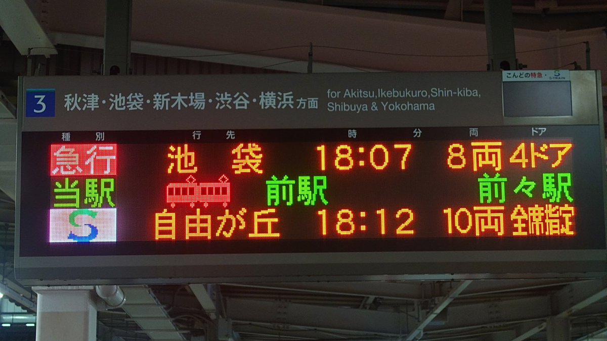 東急線内遅れの影響で「西武線内から」 Sトレイン自由が丘行きで運転されました 車両の表示が対応してるのはともかく西武線内の発車標に「自由が丘」が出るのも滅多にないことですね