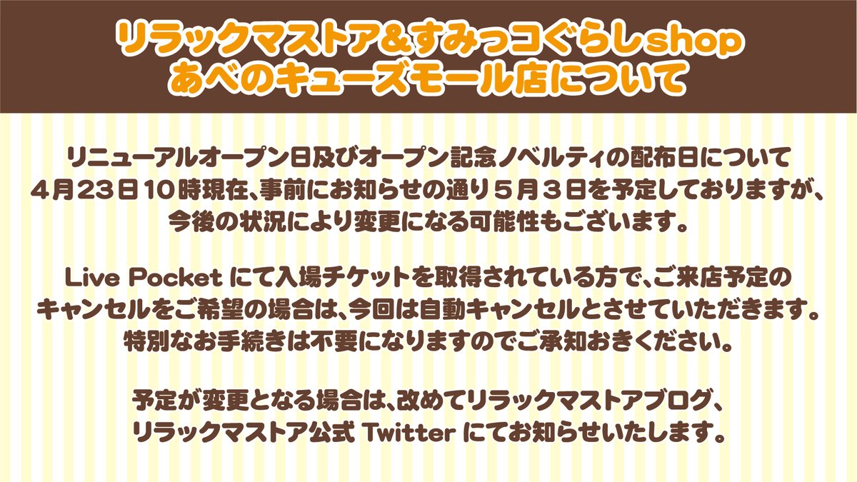 リニューアルオープン日について4月23日10時現在、事前にお知らせの通り5月3日を予定しておりますが、今後の状況により変更になる可能性もございます。