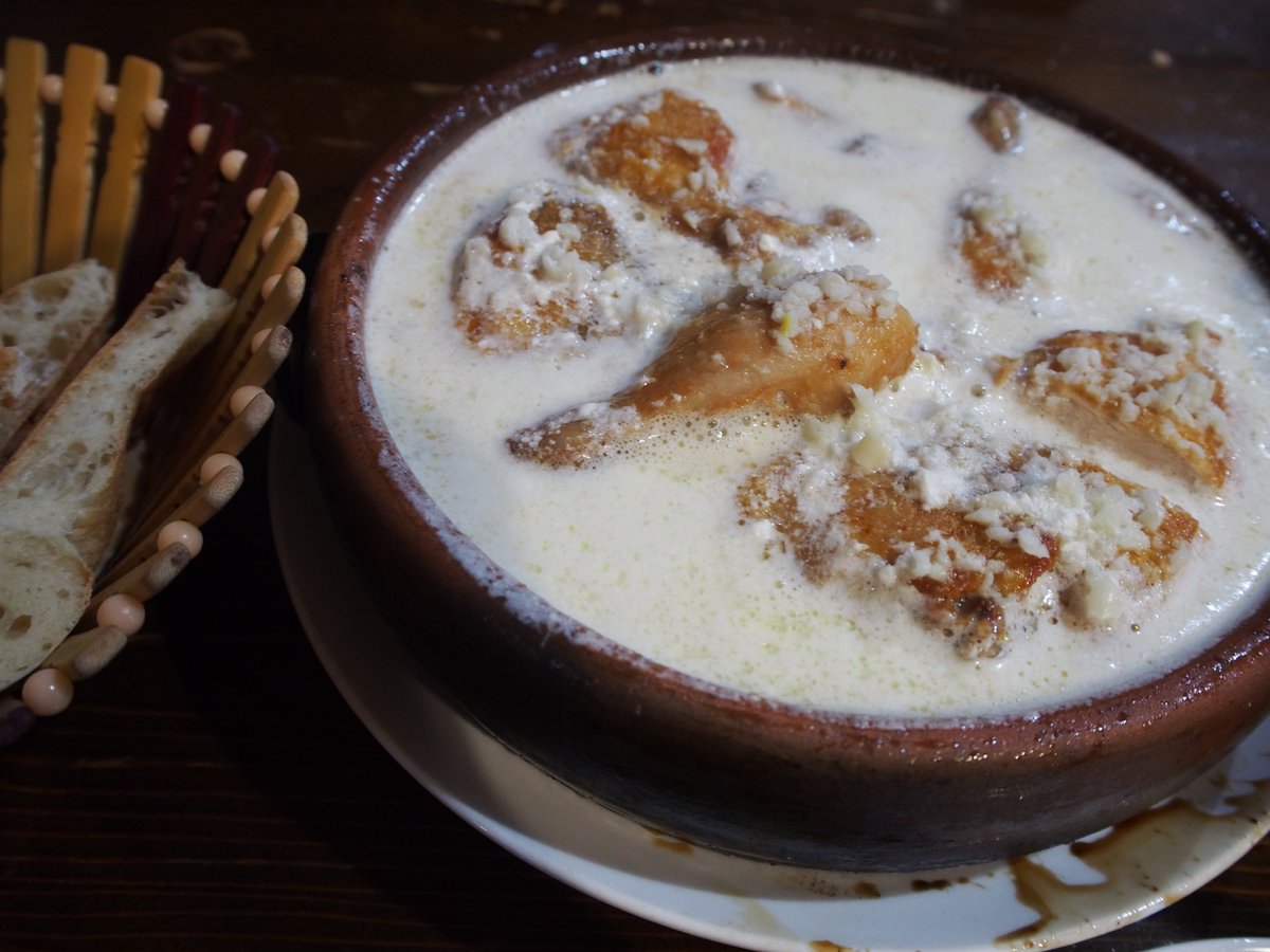 これ本場のシュクメルリ。松屋のやつはニンニクやばいって感想あったけど、本場は表面も底もゴッソリニンニクみじんまみれで、多分余裕で一玉分くらい使ってるので比較にならない。と西から目線。 量も500円くらいでアホほど多い(鶏肉一羽分)し、食った感想は『共産圏の二郎』。麺ヤサイヌキだけど。