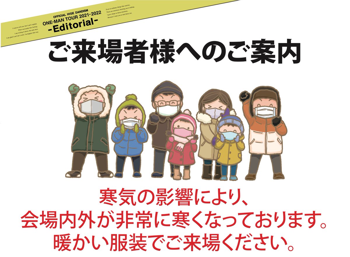 本日からの真駒内セキスイハイムアイスアリーナ公演におきまして、寒気の影響で会場内外の極度の冷え込みが想定されます。どなた様も暖かい服装でご来場くださいますようお願いいたします。