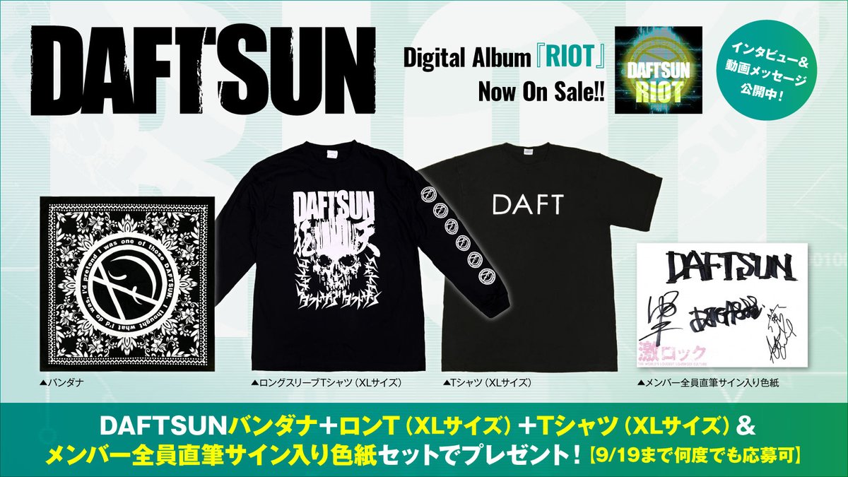 DAFTSUNバンダナ+ロンT+Tシャツ(各XL)&メンバー全員直筆サイン入り色紙プレゼント!