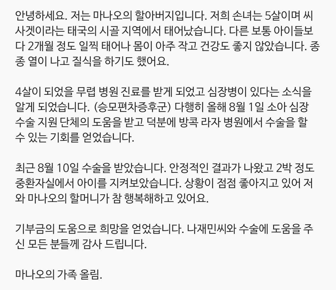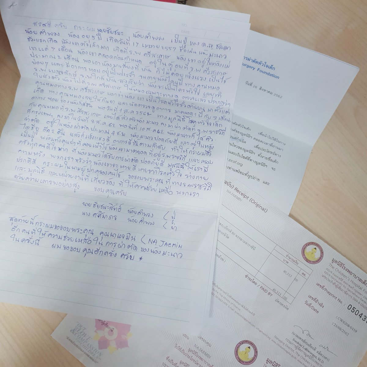 태국에서 공동으로 개최했던 전시회 수익금 기부 증명서 및 @dearnajaemin 수혜자분의 편지입니다 얼마 전 한국으로 원본을 받아 회사로 전달했어요 수혜자 가족분의 편지 번역본을 같이 올립니다 재민이의 이름이 좋은 방향으로 널리 퍼졌으면 좋겠습니다 감사합니다 남은 연휴 즐겁게 보내세요!