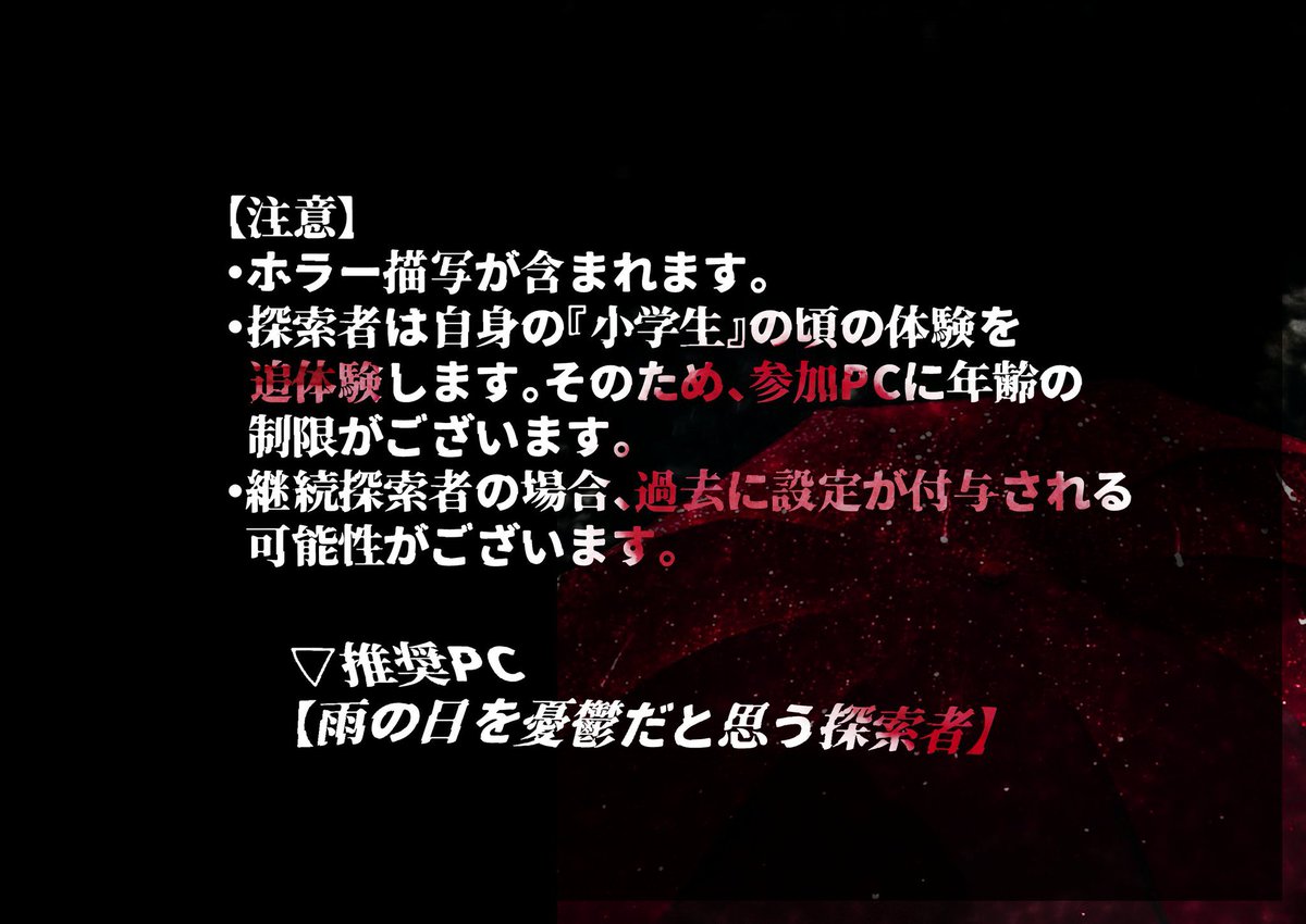探索者の【小学校時代】を体験していく、ちょっと特殊なシナリオ!雨の日のじめじめした感じや、小学校の頃の怖いウワサが好きな方はぜひに❣