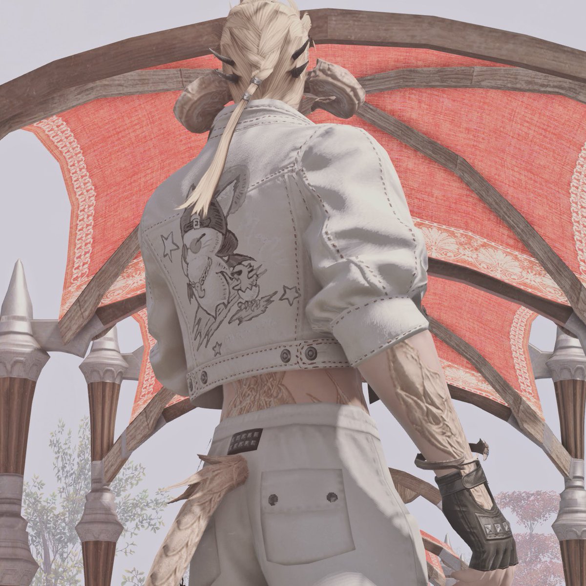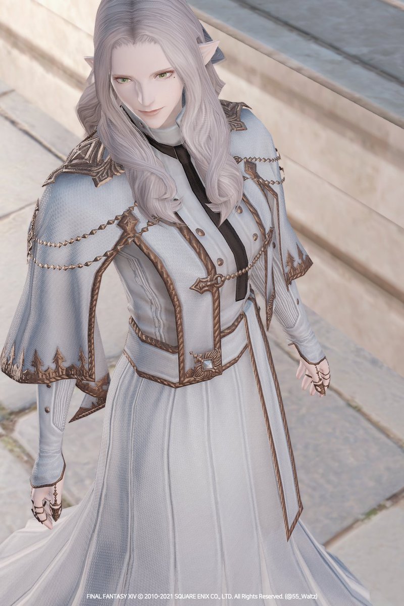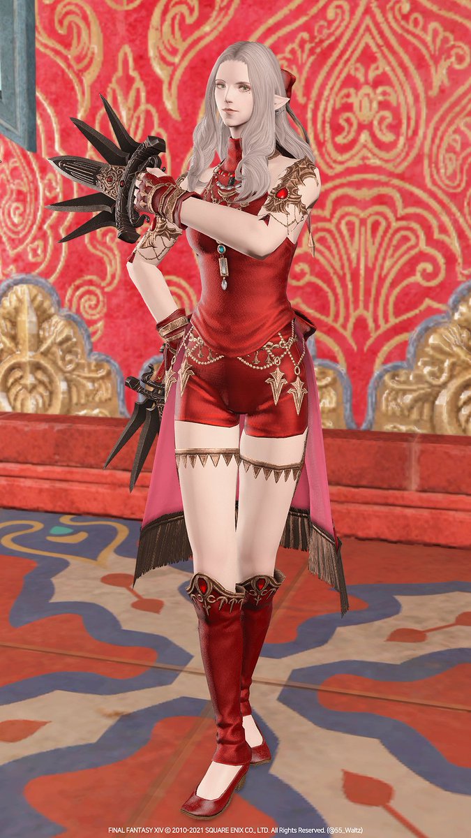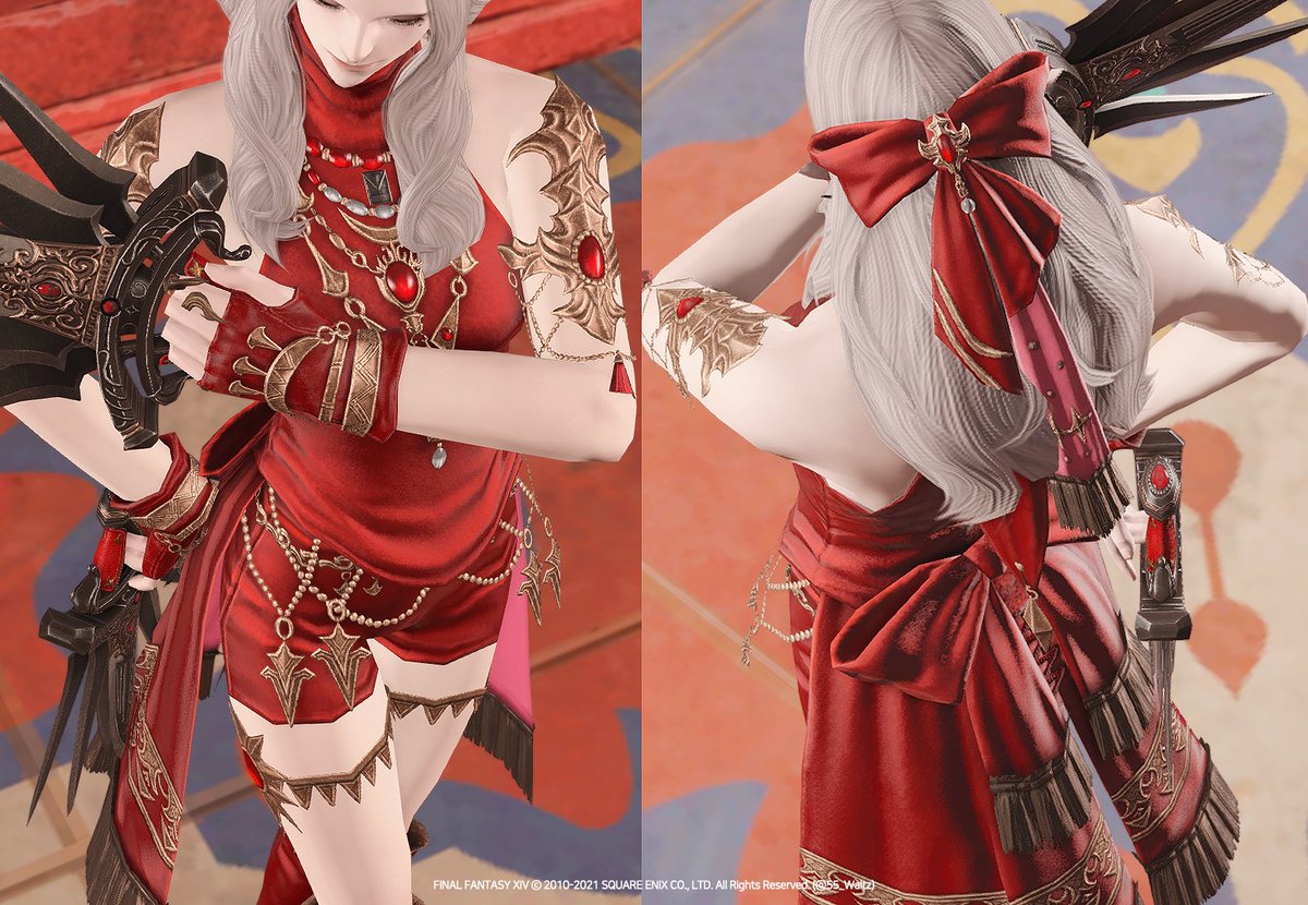 미리 공개된 스크린샷으로 보았을 때 보다 실물이 더 화려하고 디테일한 장비입니다. 머리 리본이 포인트! 파츠별로도 다양하게 활용할 수 있을 것 같아요. (남녀 외형 다름, 롤 퀘스트 이후 염색 가능) #ff14