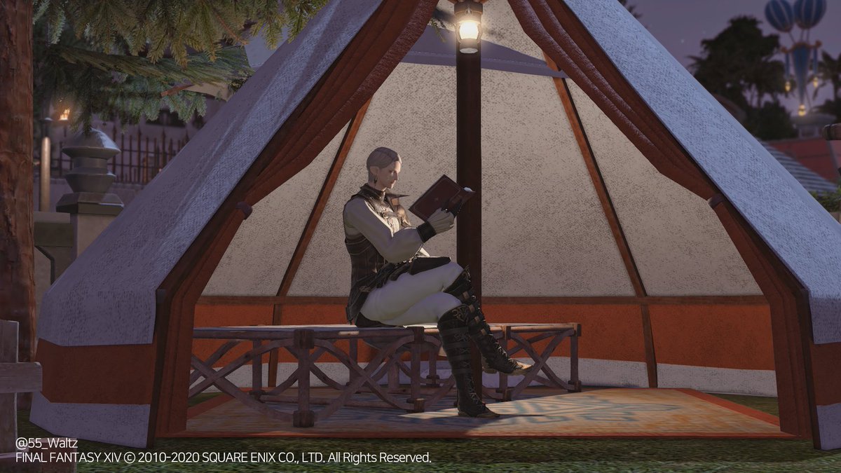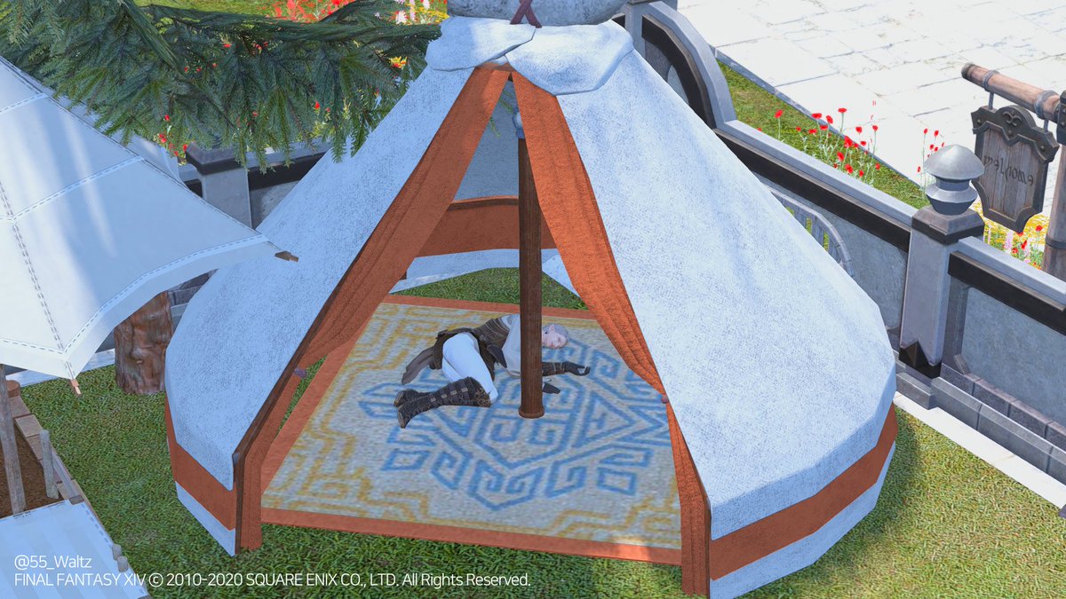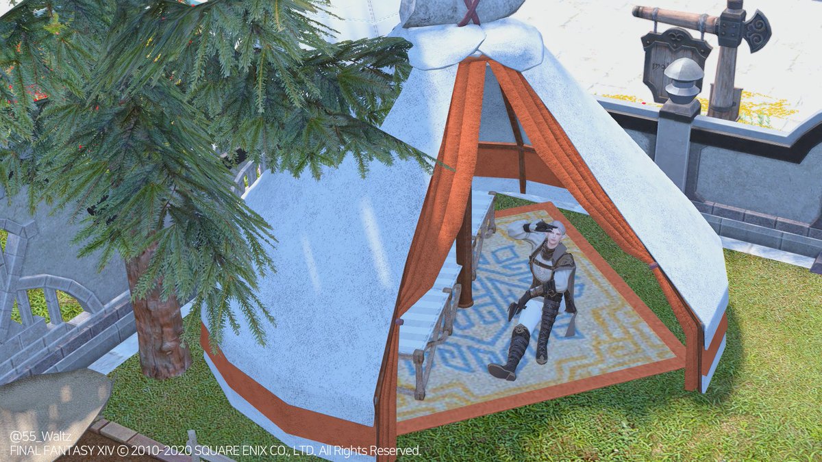 아짐의 텐트를 그대로 가져왔어요. 집안보다 마당에 주로있는 저같은 유저에게 매우 반가운 아이템이라 바로 설치했습니다. 재봉80 제작, 내부조명 포함. (바닥에 누워있는건 하우징트릭.상호작용 없는 가구입니다/해변의자를 겹쳐 사용) #ff14