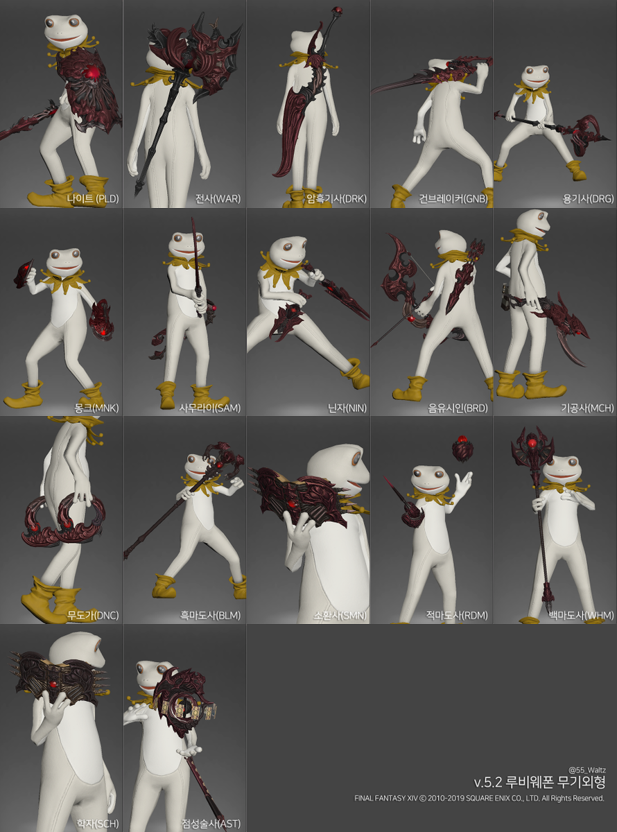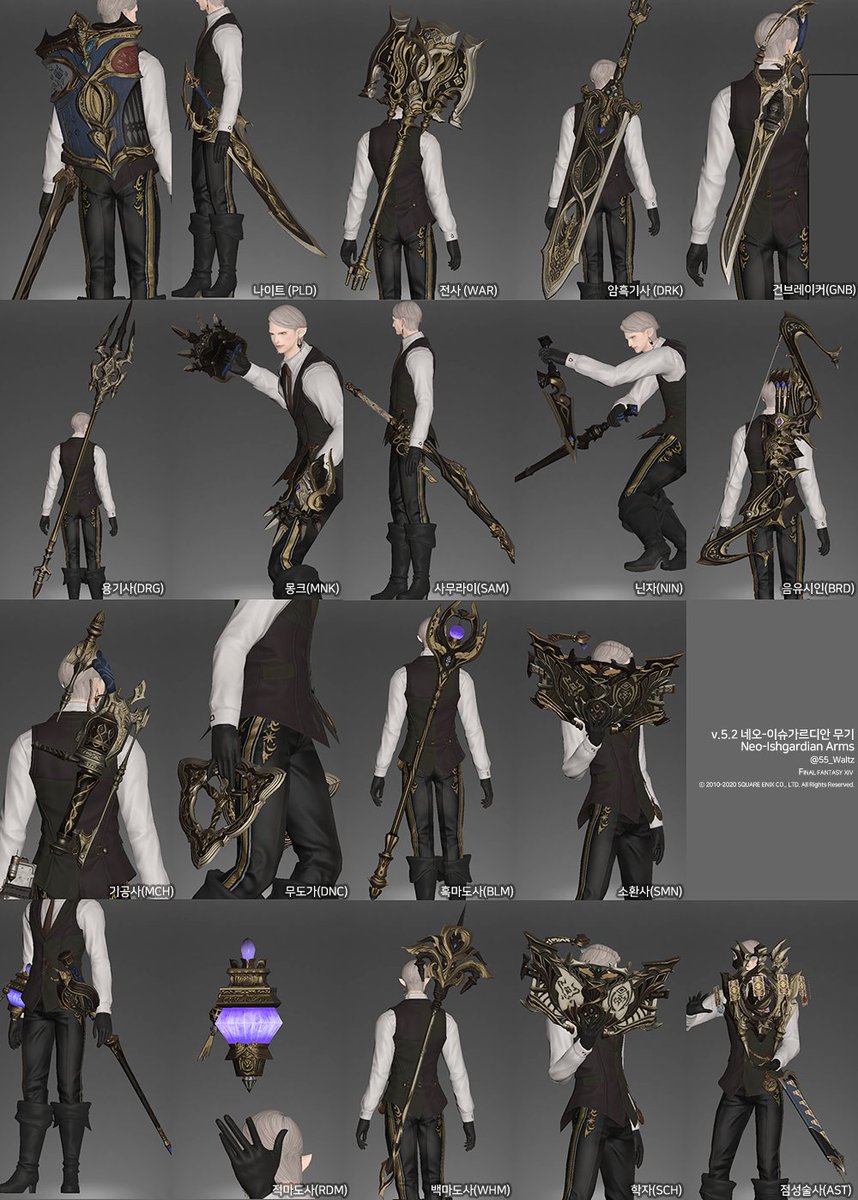 찍다가 인력 모을바에야 지금부터 16클을 하는게 낫겠다 하고 우선 이정도만 찍고 말아버렸습니다ㅎ.. 디자인컨셉에 있어선 무기들간 약간의 갭이 있다고 느껴집니다(개인적) #ff14