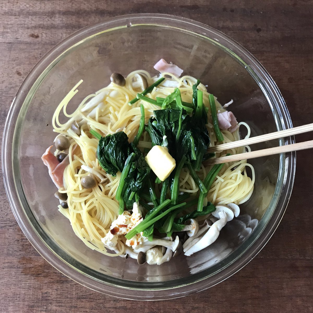 ③ラップ無しでパスタの表示茹で時間+5分チン。茹で汁が多ければ流し(底に少し溜まってるぐらいがベスト)、①、バターかマーガリン20g、醤油小さじ2を混ぜ塩胡椒で調える