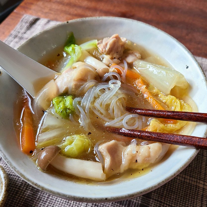 具はあるものでOK。間違いないコンソメ醤油味で野菜もタンパク質も取れ、少しの春雨で満足感もあるんで是非作ってみてください✨