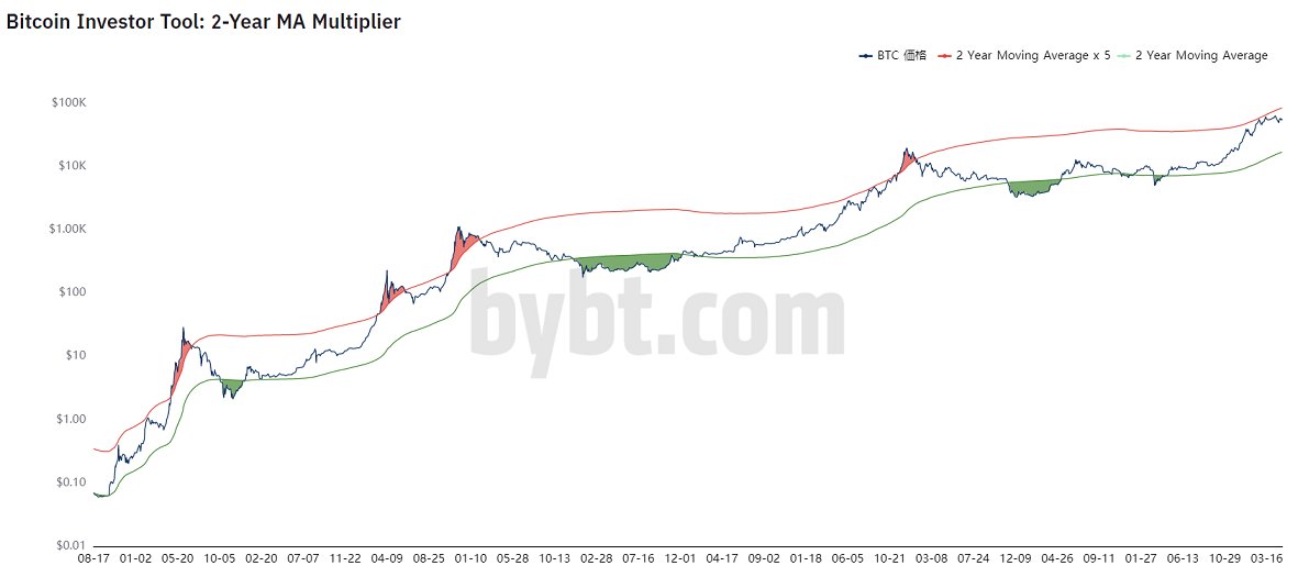 BTC価格が2年移動平均線(緑線)を下回ったときにビットコインを買うと、2年移動平均線×5(赤線)を上回ったときにビットコインを売ると、歴史的に大きなリターンが得られるとのこと。赤くなったら売ろう。