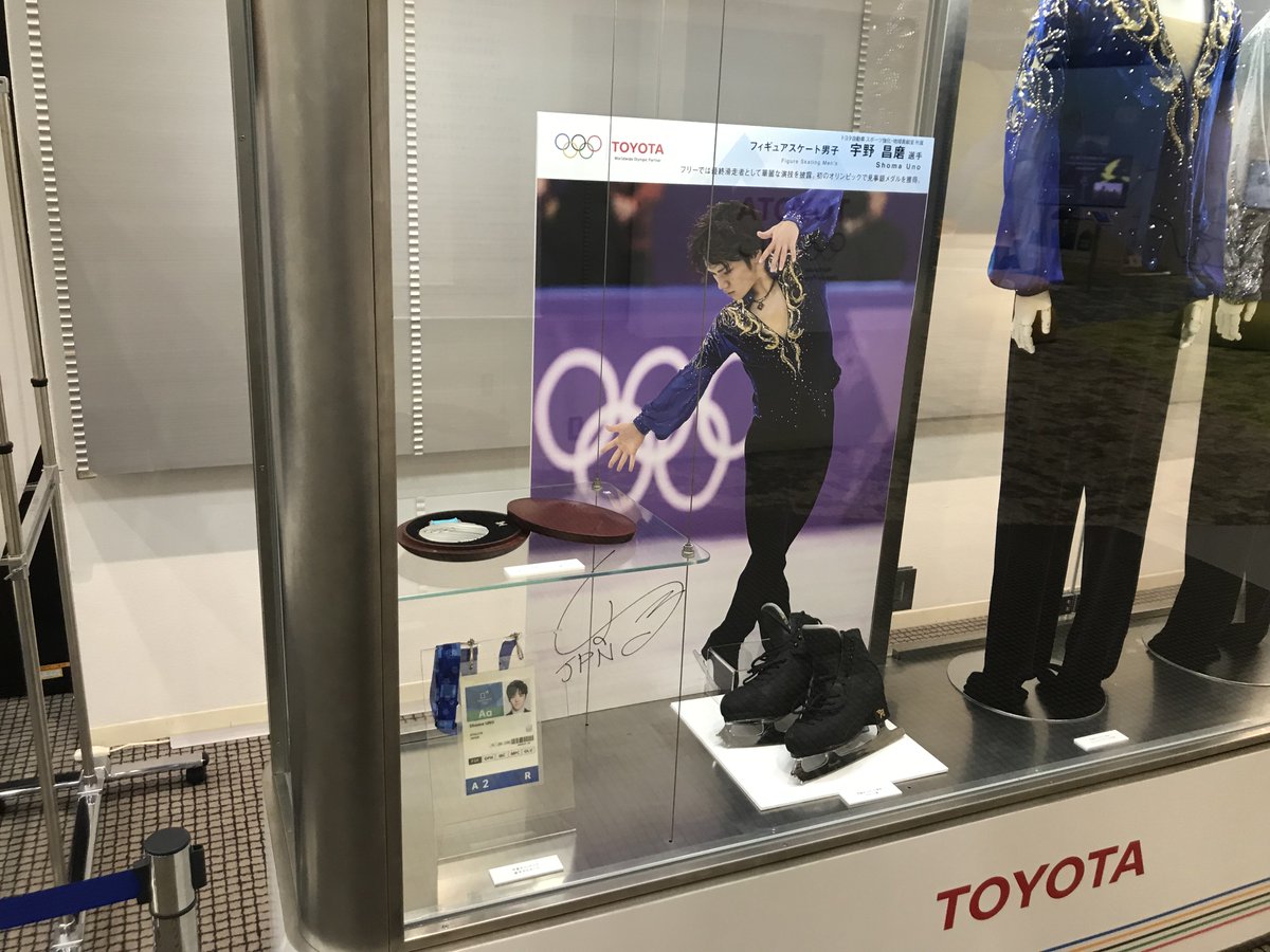 トヨタ会館広報担当「カイ」です。男子フィギュア・宇野昌磨選手の平昌オリンピック使用品を展示開始!実際に使用した衣装、選手ADなど、貴重な品を特別展示中です。トヨタ会館で、あの時の感動を思い出してください♪