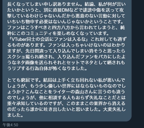 vtuberの炎上って真実が100%わからない状態が普通だから結局誰が悪いのかで討論されるけど、「よくわからないけど、○○ちゃんは悪くないよ!元気出して!応援してる!」的なリプを見ると全部そっちに持ってかれる。キメェ〜〜〜〜!もう全部お前らが悪いだろってなる