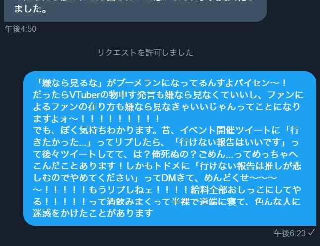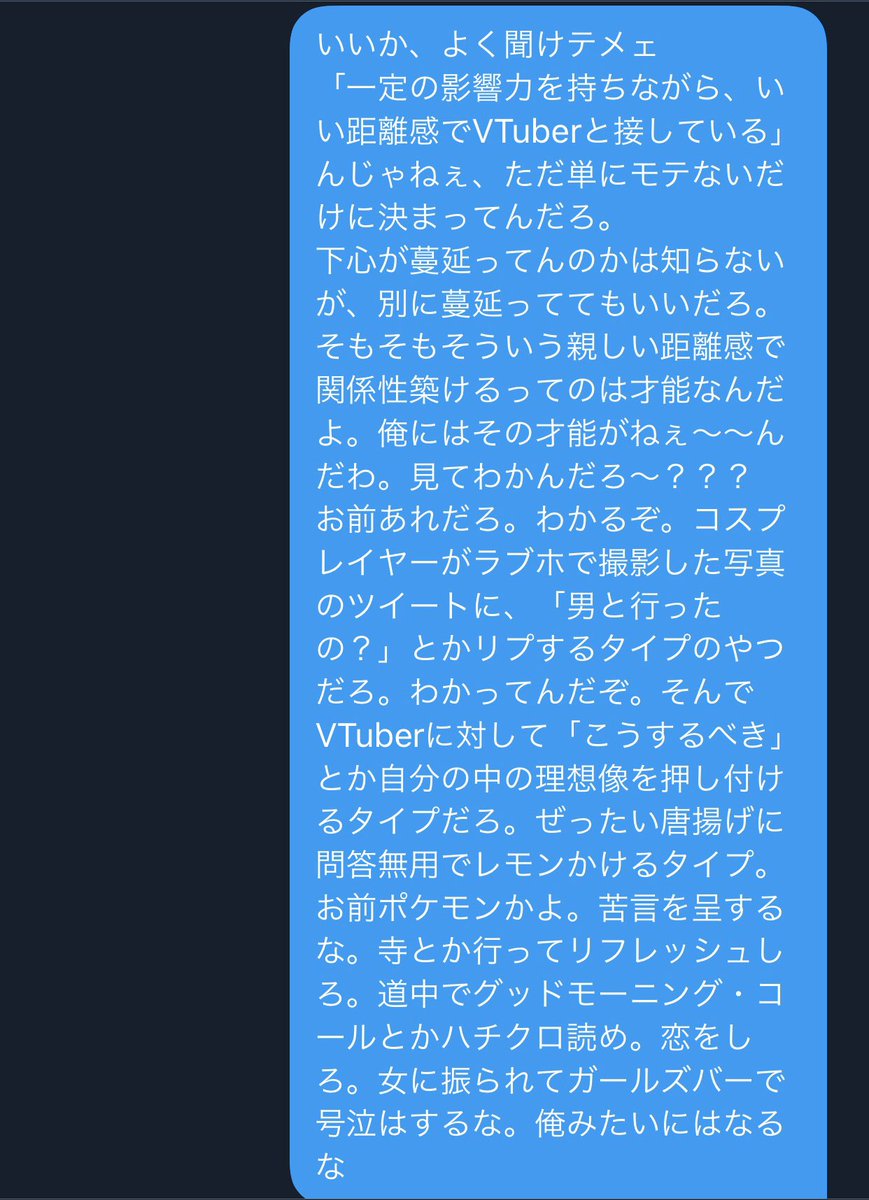 今までvtuberに暴言吐いてたアンチから「vtuberはAIだから訴えたりしない。訴えると中身が人間だということを認めることになるから」ってDMがきてて、1日の始まりを噛みしめてます。仕事頑張ります