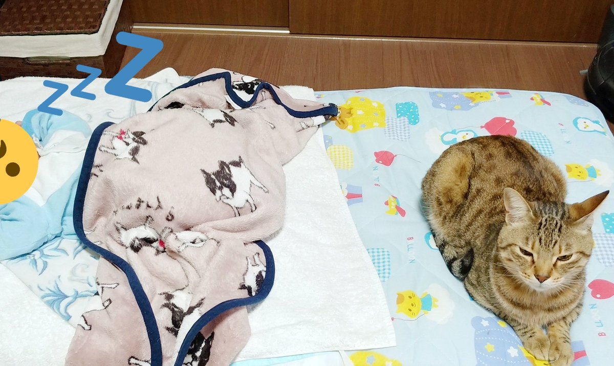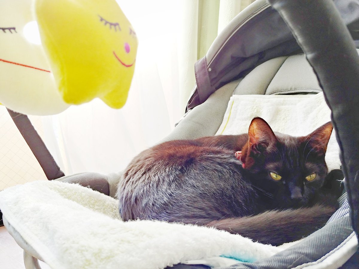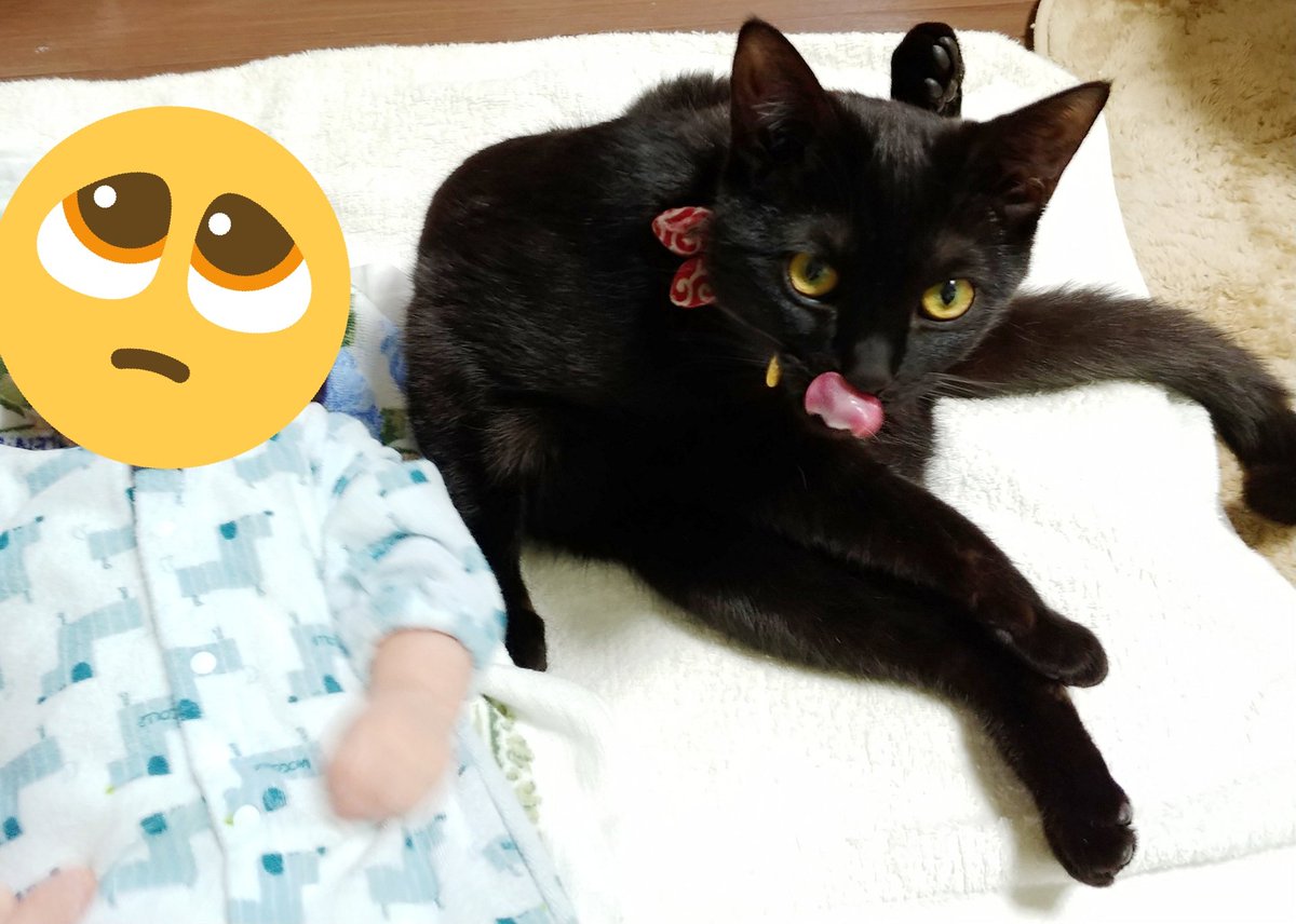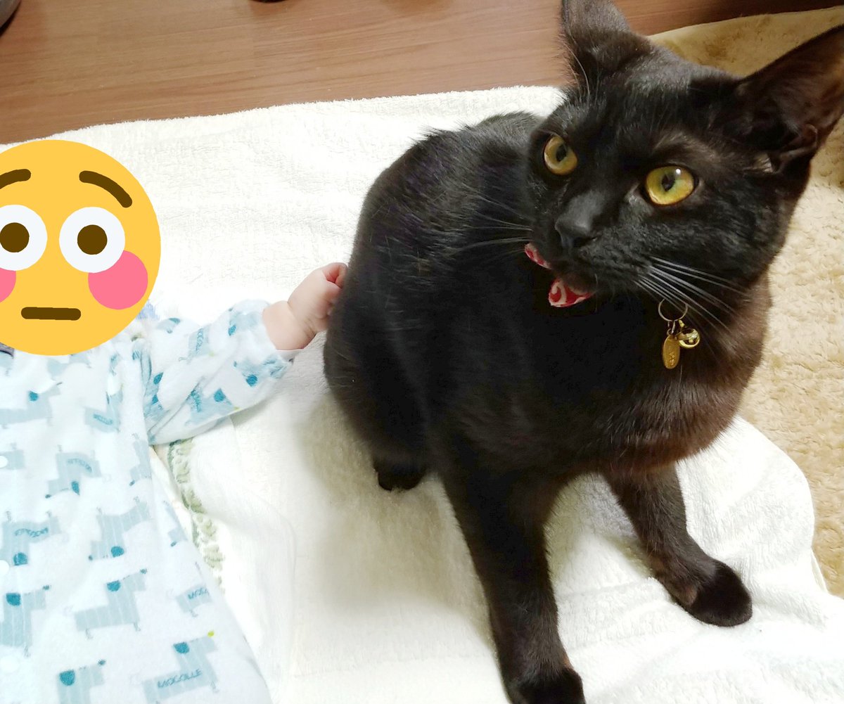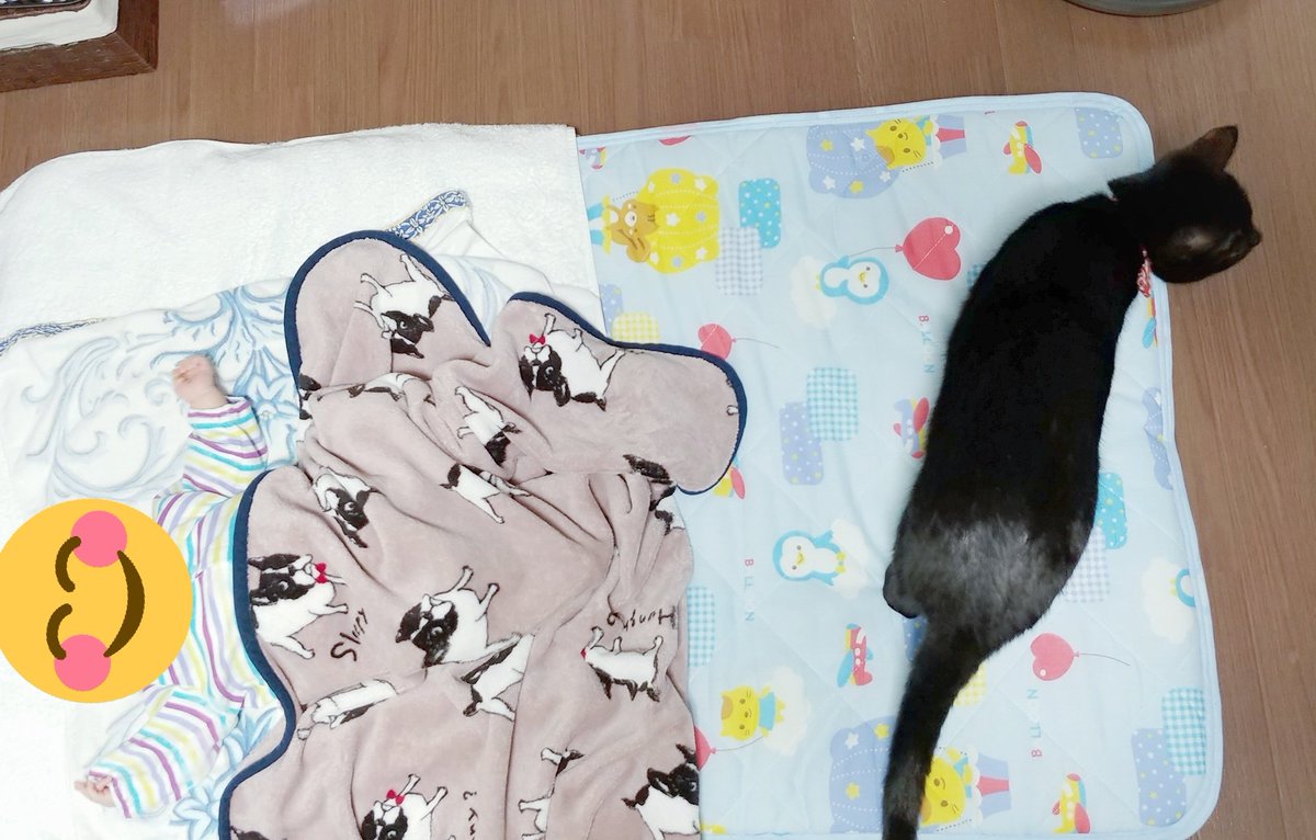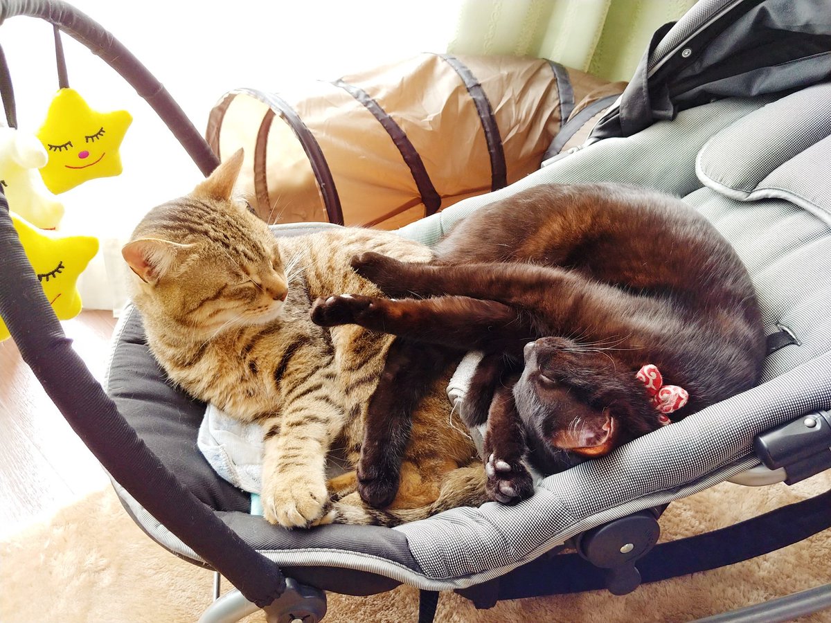 あいつたまに鳴くけど人間語でも猫語でもないなぁと思いつつ一応様子を伺うキジトラ(キジトラの目線の先に乳児)、とりあえず適当に尻尾で返事だけする黒猫