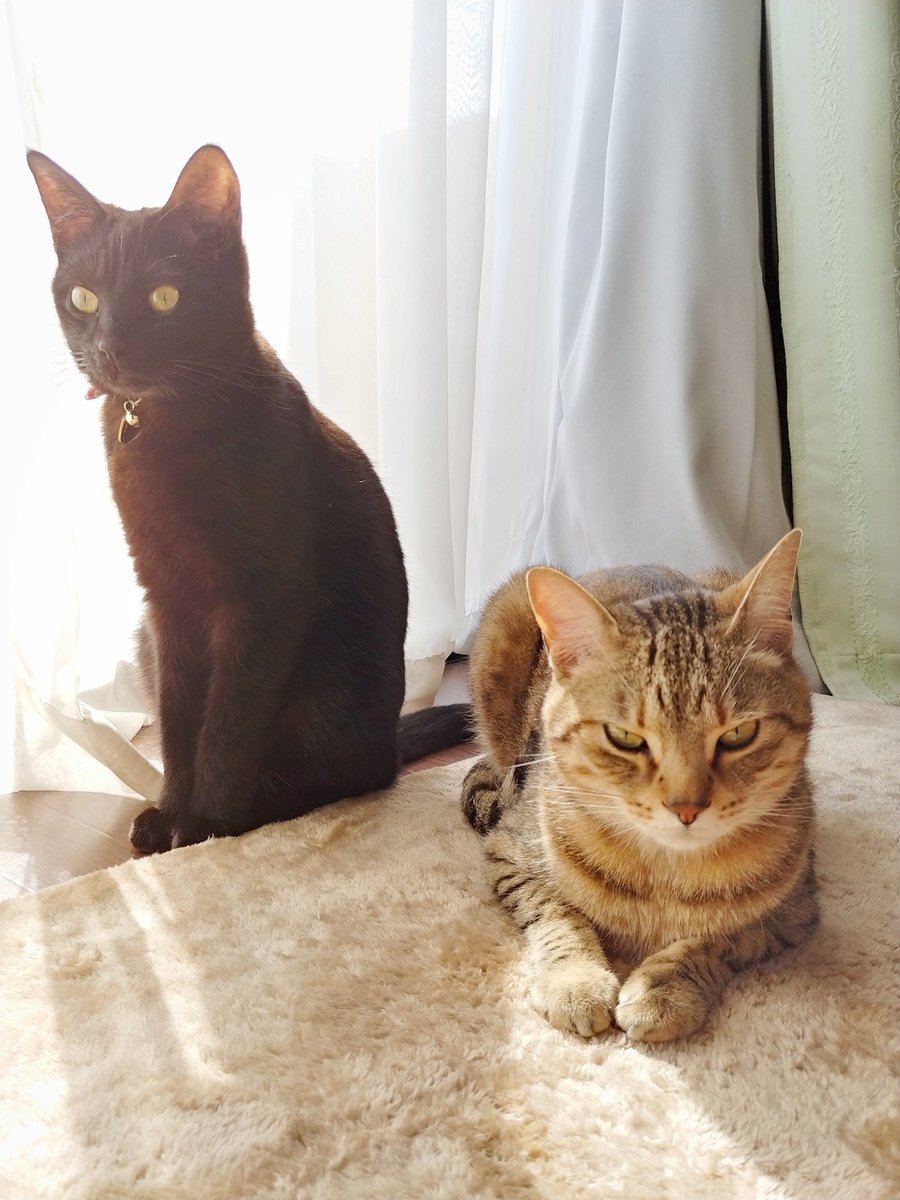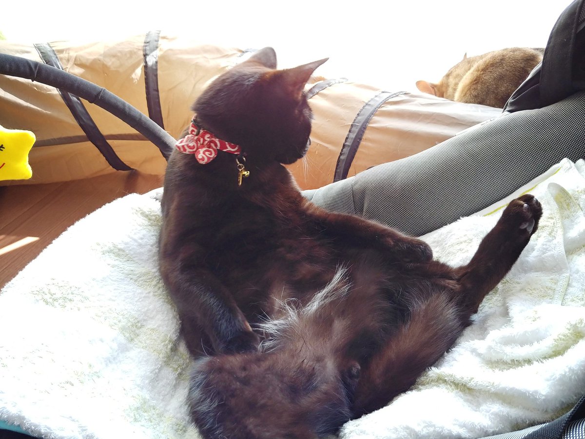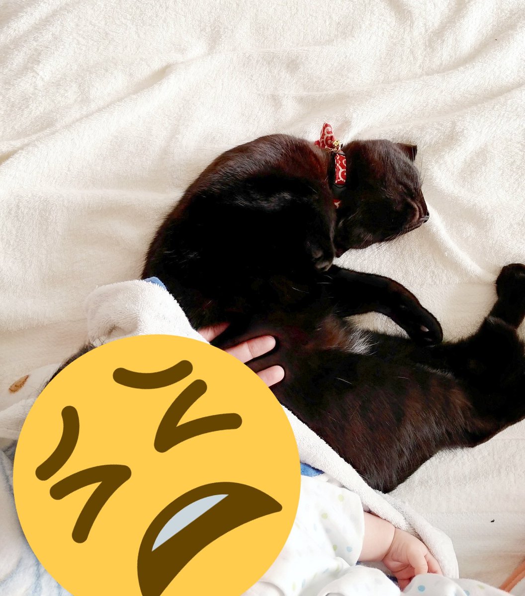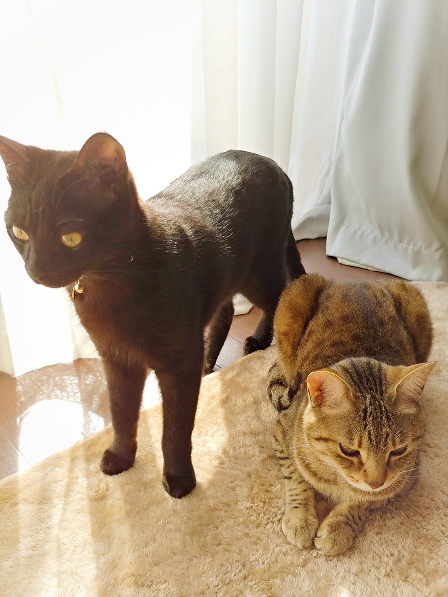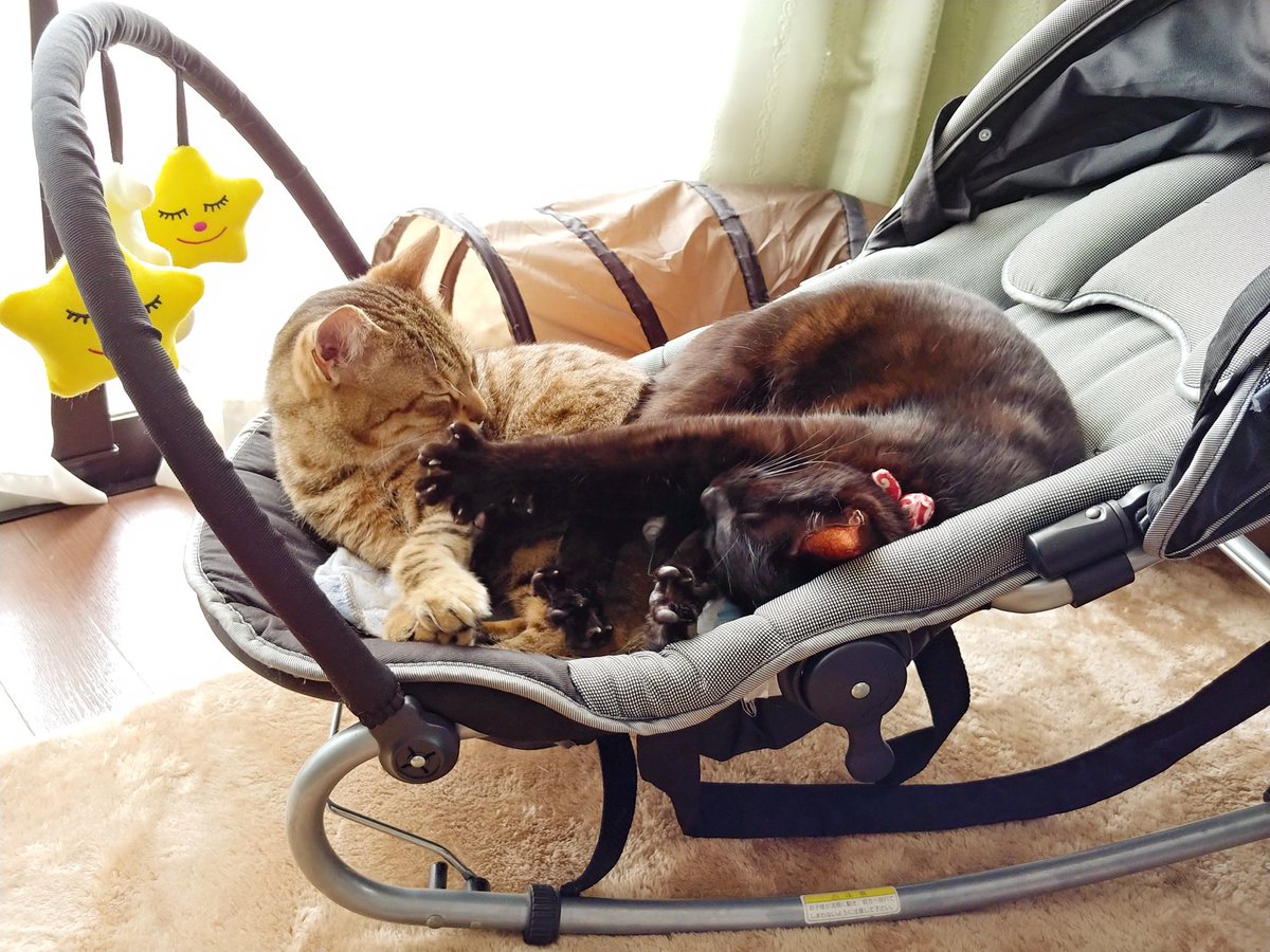 あいつたまに鳴くけど人間語でも猫語でもないなぁと思いつつ一応様子を伺うキジトラ(キジトラの目線の先に乳児)、とりあえず適当に尻尾で返事だけする黒猫