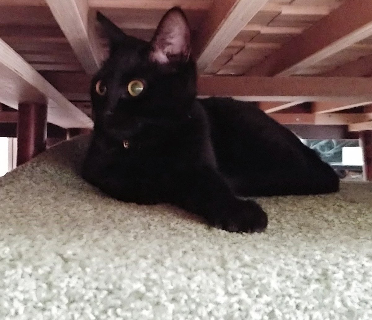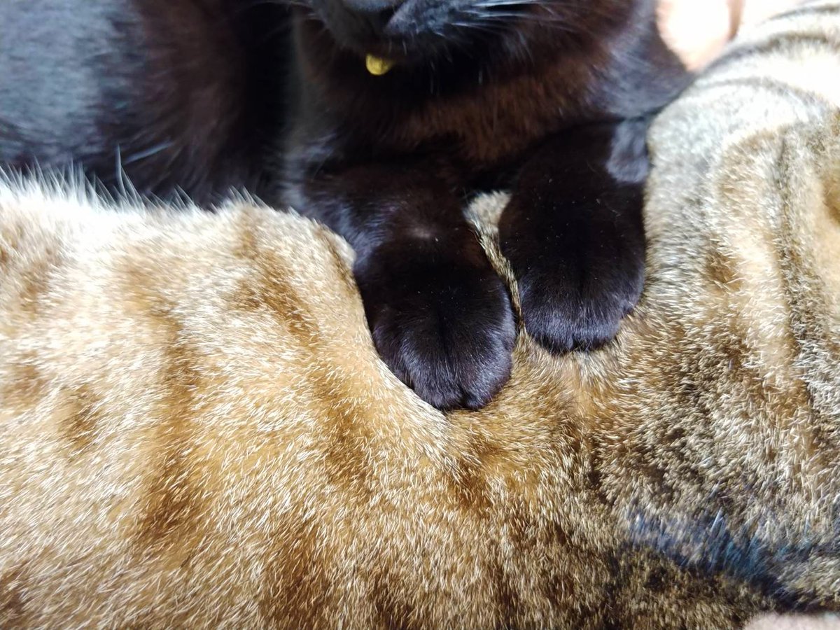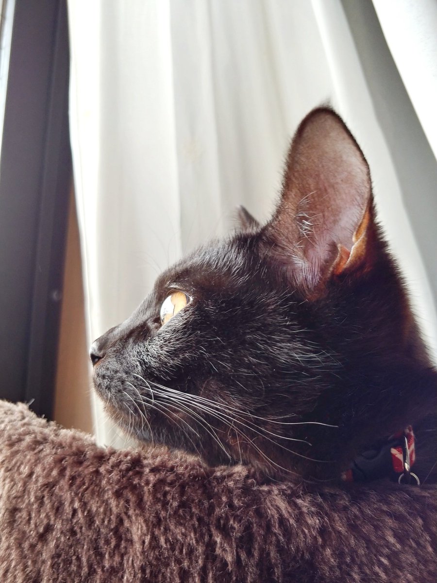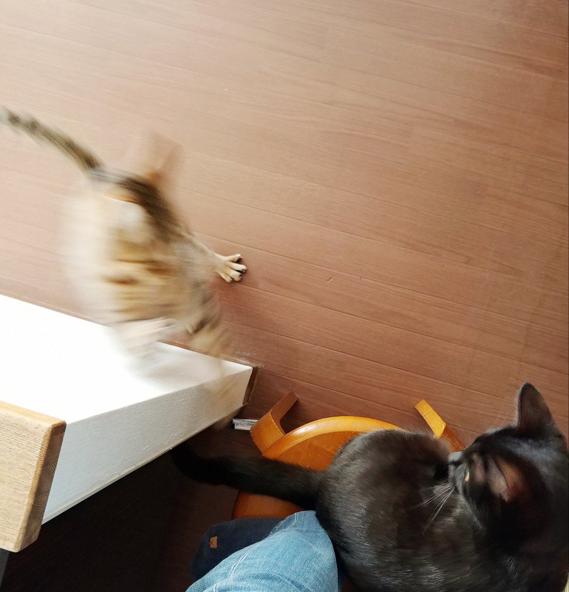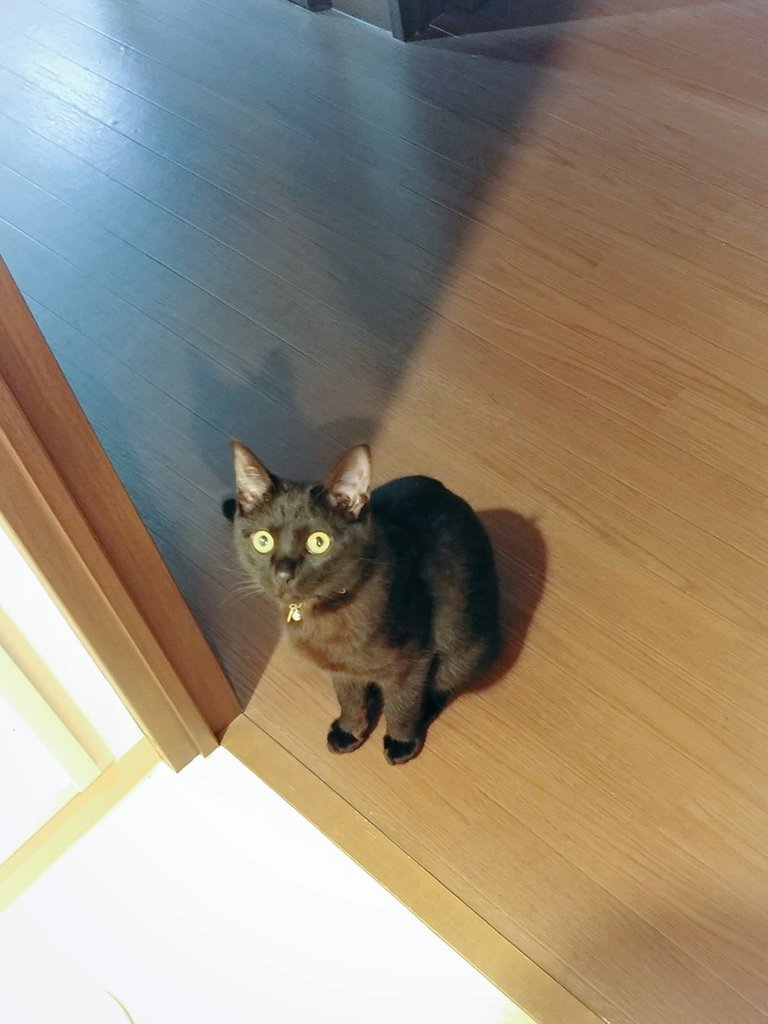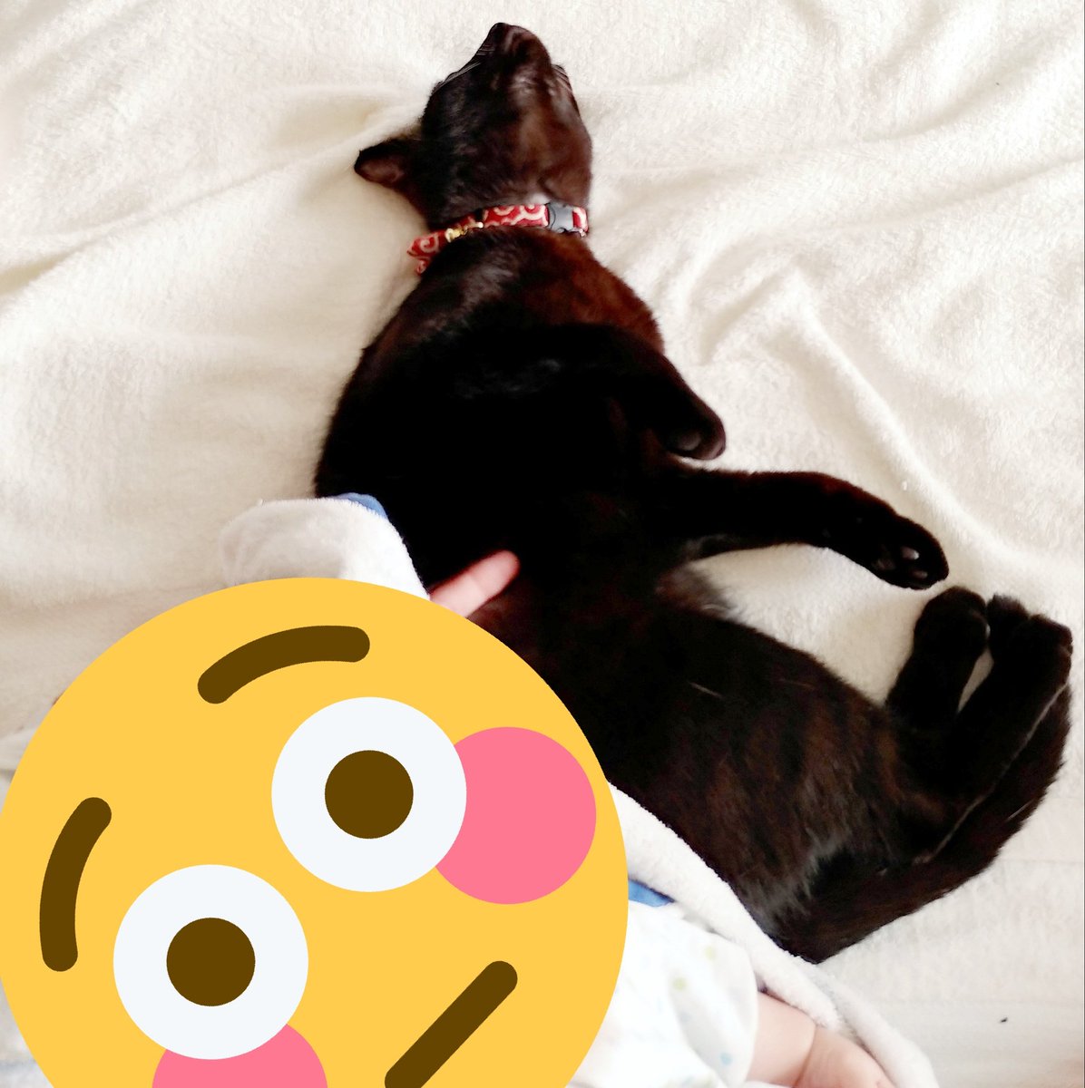 あいつたまに鳴くけど人間語でも猫語でもないなぁと思いつつ一応様子を伺うキジトラ(キジトラの目線の先に乳児)、とりあえず適当に尻尾で返事だけする黒猫