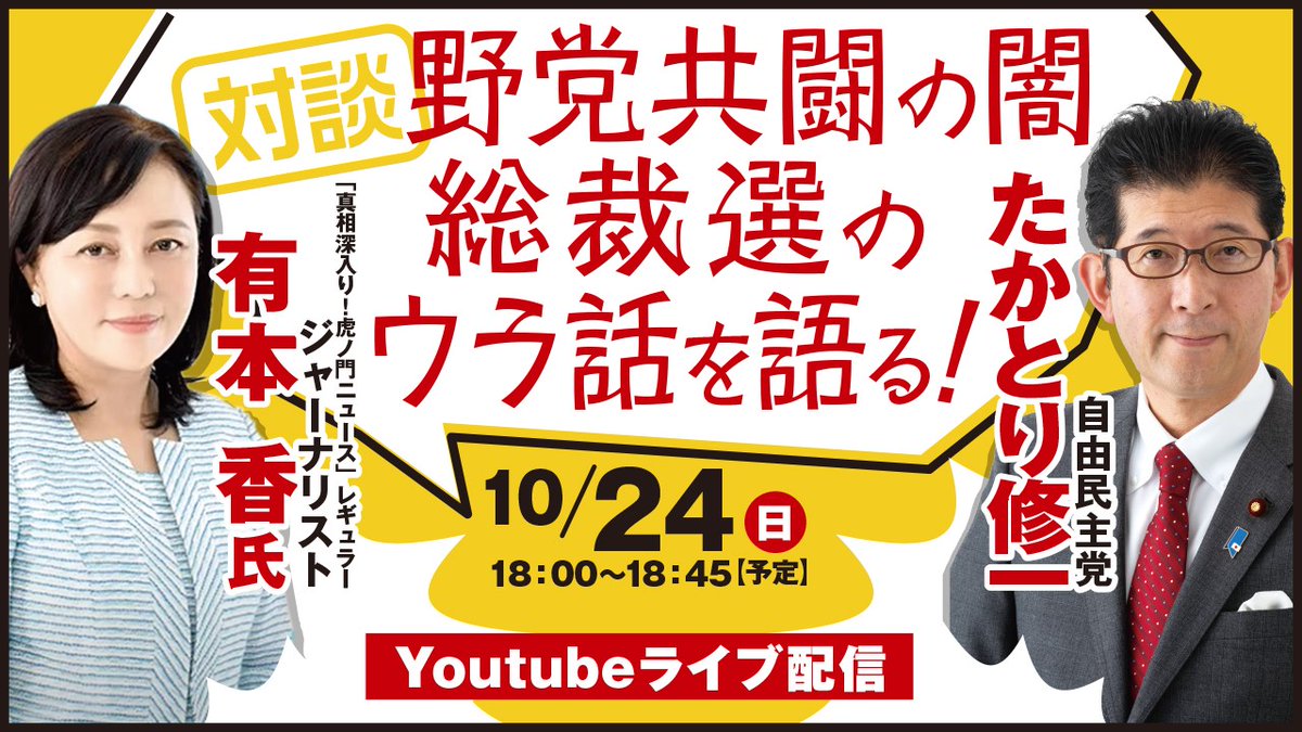 10月24日(日)は、18:00(予定)より、ジャーナリストの有本 香さんをお迎えし、対談形式で行います。