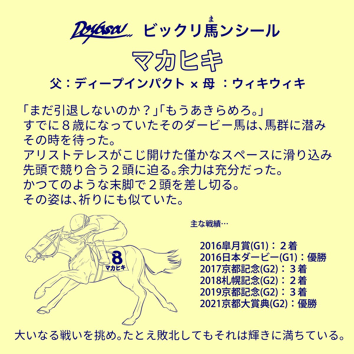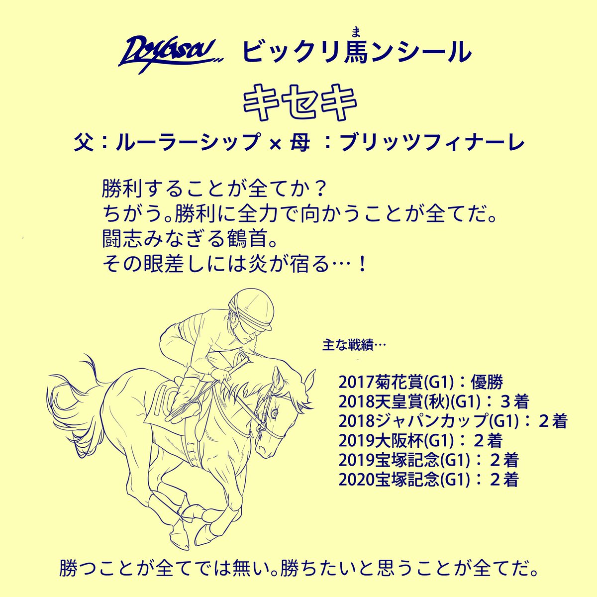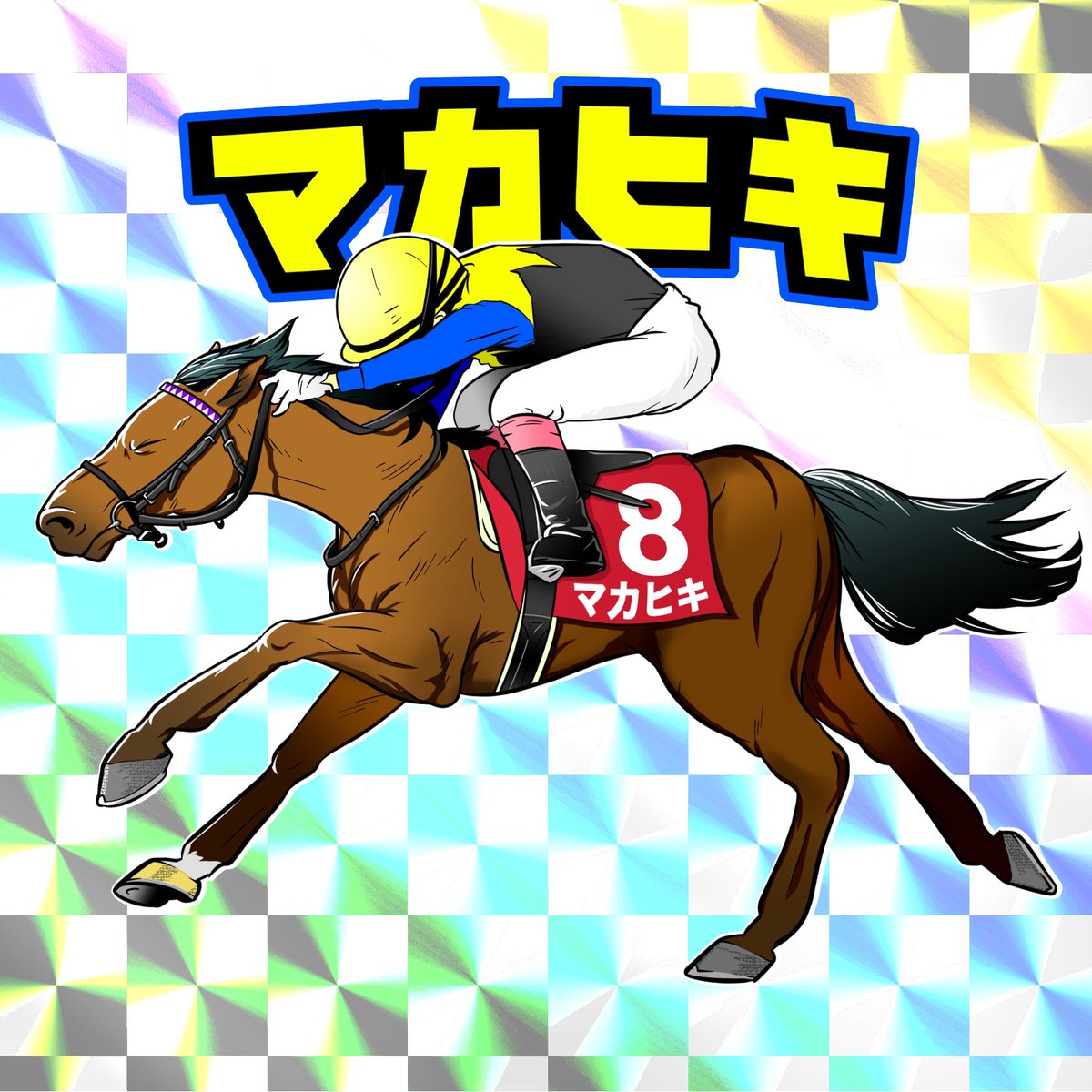 ビックリマン風の競走馬イラストを描いてます。