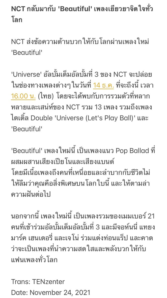 เนื่องจาก TENzenter เคยแจ้งไว้ว่าจะตั้งทีมสตรีมเพื่อสนับสนุนเตนล์ใน #NCT2021 แต่ขอรอดูการมีส่วนร่วมของเตนล์ในอัลบั้มนี้ก่อน ซึ่งเราเห็นว่าเตนล์ไม่ได้มีส่วนร่วมในเพลงโปรโมทในอัลบั้ม NCT - The 3rd Album 'Universe' จึงขอประกาศยกเลิกการจัดตั้งทีมสตรีมค่ะ