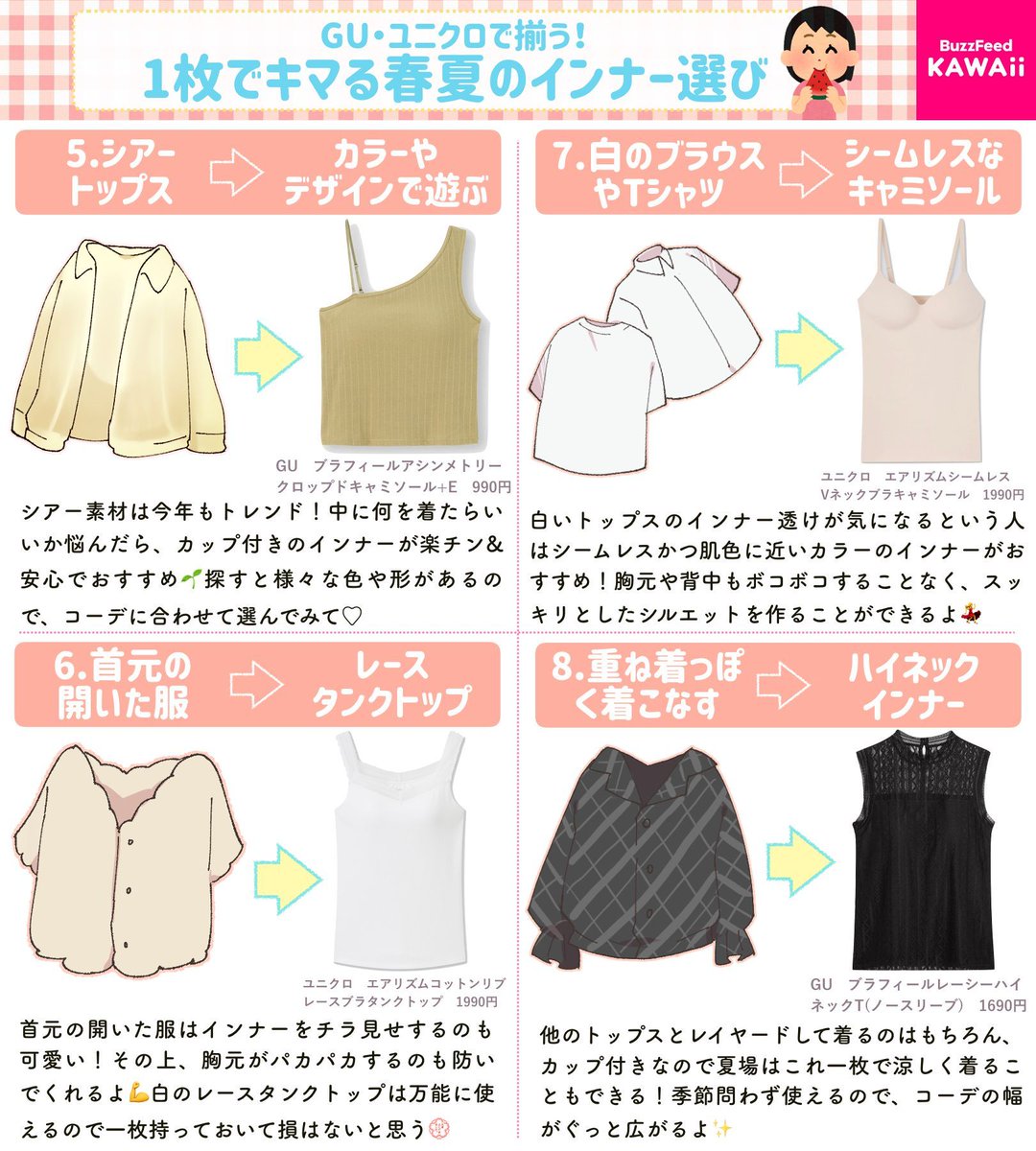 オフショルやシアートップスのインナーって何着たらいいの?🧐 という人へ! GU・ユニクロで揃う「春夏おすすめインナーアイテム」とその選び方についてまとめました!🔎👗