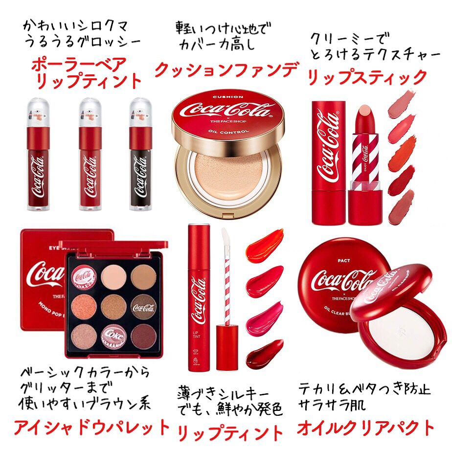 平成最後の夏に最高なコカ・コーラのコスメ見つけてしまって、ぜんぶ買うしかないのです…しかも韓国の人気ブランドとのコラボ…むっちゃかわいい…。汗でメイク崩れる人は、右下のアイテムがよいです。