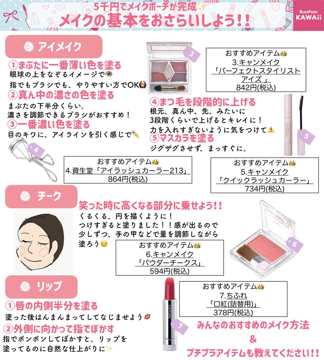 メイク初心者さん必見!メイクの基本的なやり方と、基本のおすすめアイテムを紹介します。全部買い揃えても5000円以下だよ〜!
