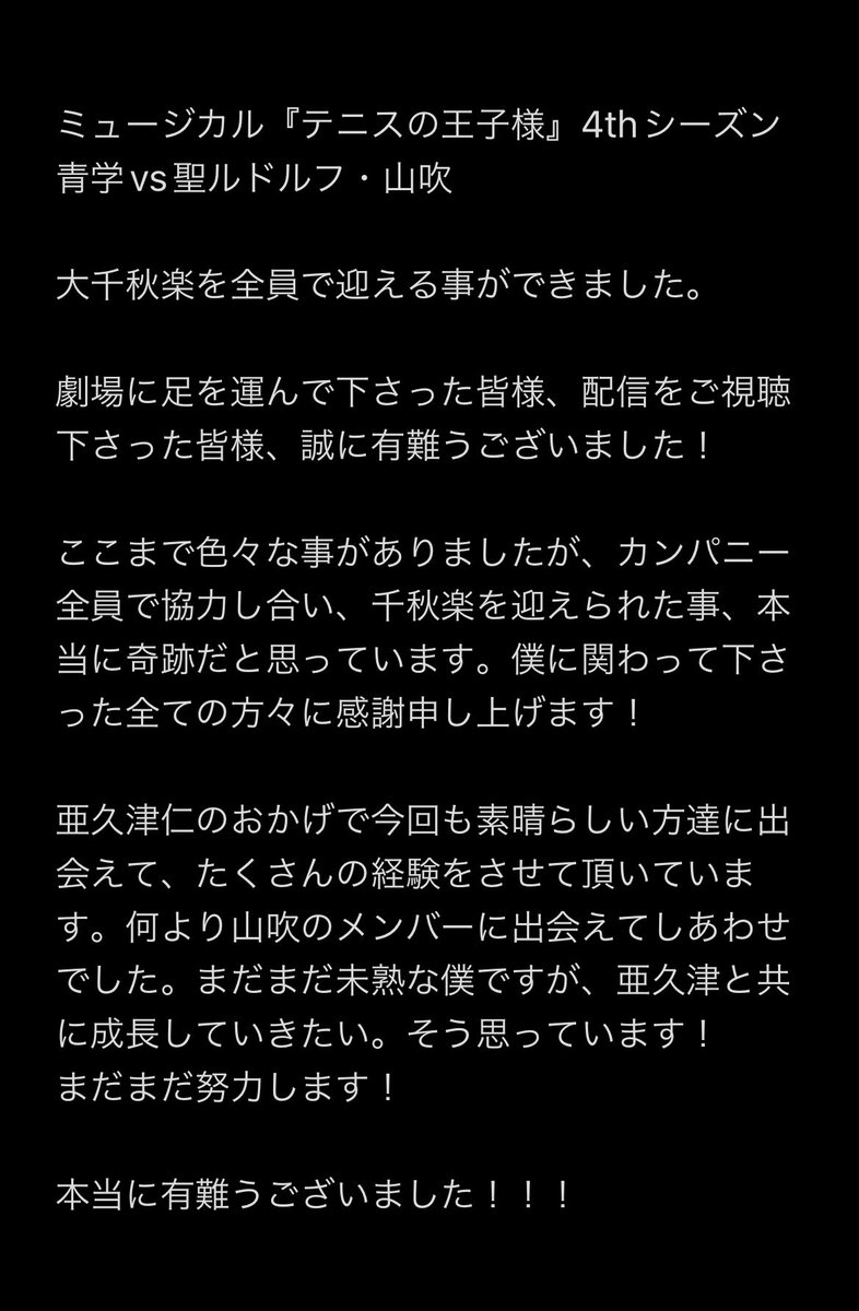 これだけは言いたいのが、新テニミュで亜久津仁を演じられて本当に幸せでした!!!亜久津!俺と出会ってくれて本当にありがとう!!!
