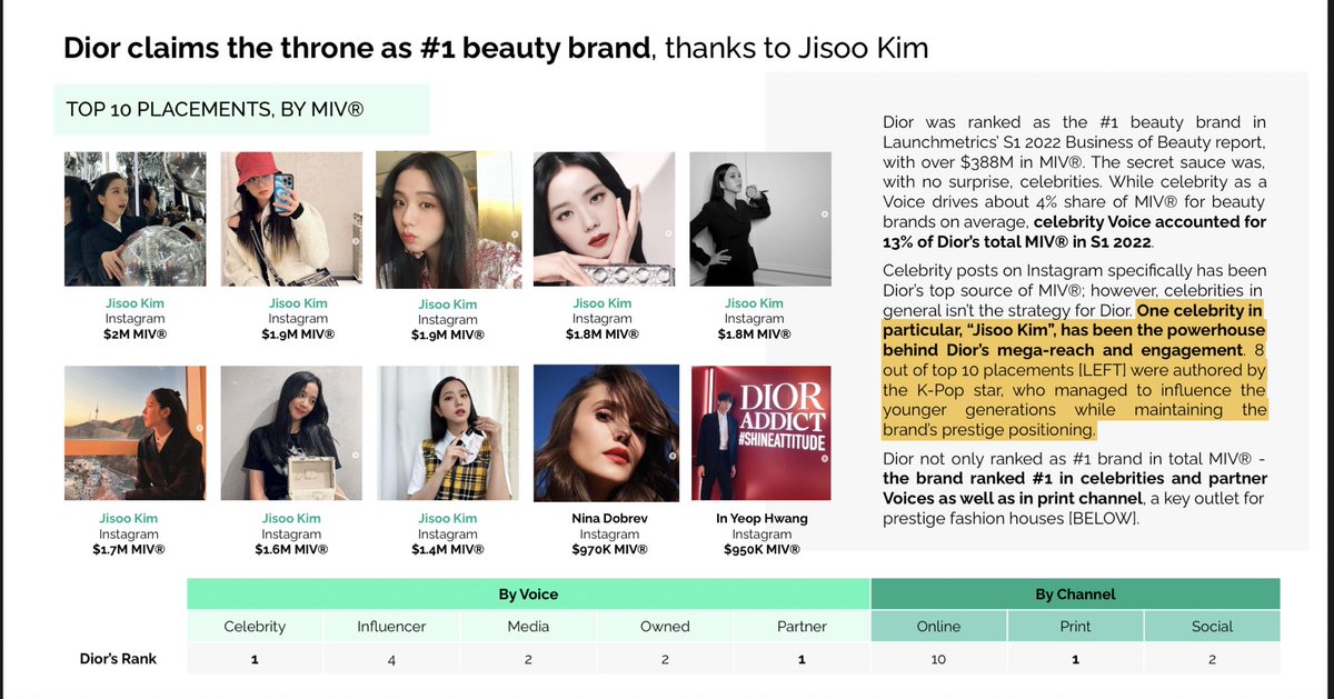 @Dior claims the throne as #1 beauty brand, thanks for #JISOO KIM. One celebrity in particular “Jisoo Kim” has been the powerhouse behind Dior’s mega reach and engagement. 8/10 top placement were by the K-pop star