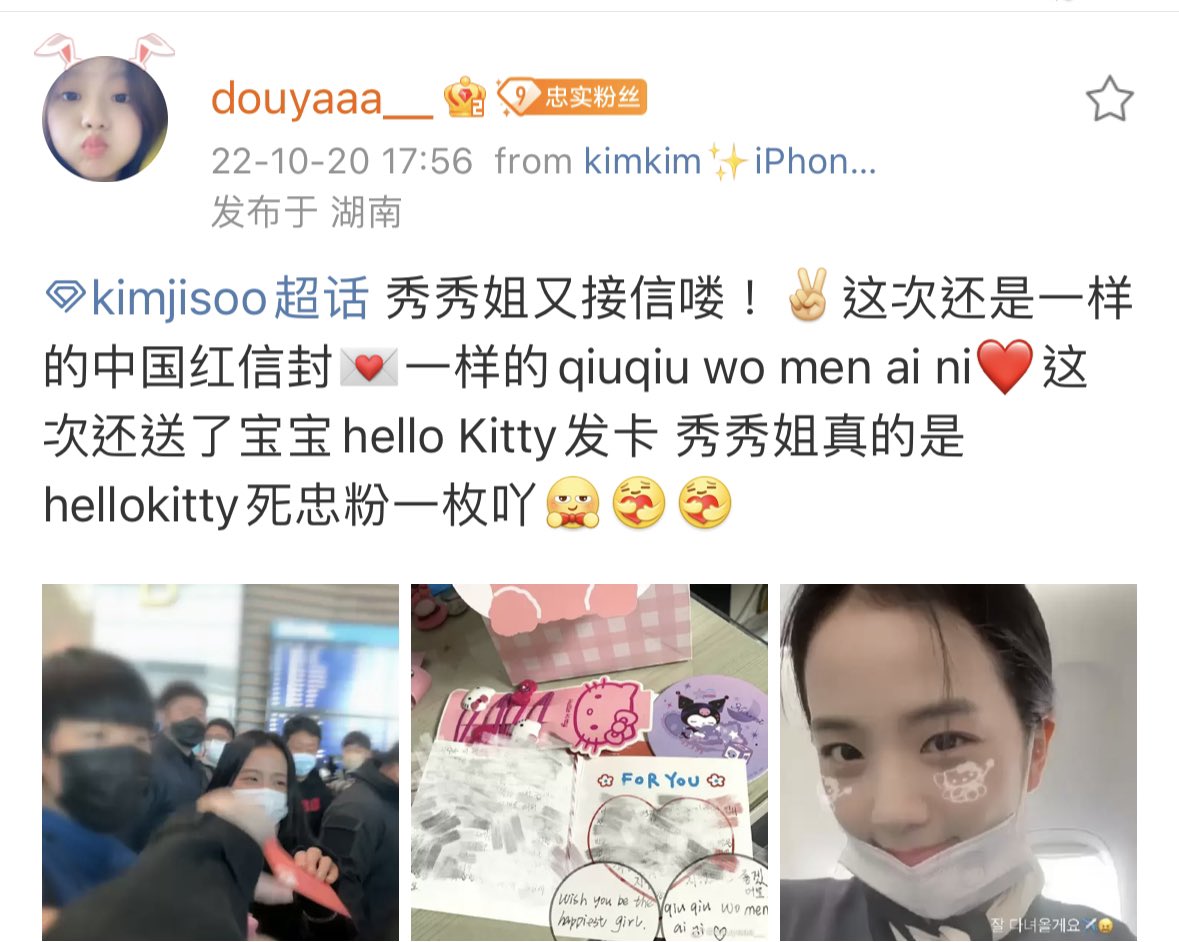 A Xiuqis successfully handed #JISOO a Chinese red envelope letter today at the ICN airport. She also gifted Hello Kitty hair clip for her 😂