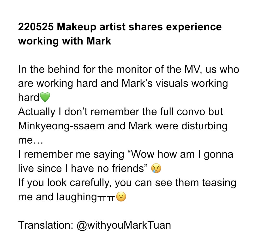“In the behind for the monitor of the MV, us who are working hard and Mark’s visuals working hard💚”