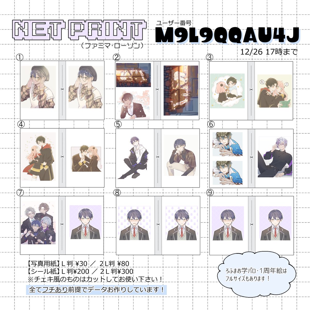 ネップリ登録しました!ファミマ、ローソンにてプリントできます☺️イラスト全て【フチあり】設定必須!リプやマロでのご報告もお待ちしてます!!!(画像つきだと尚喜びます)不明点などあれば気軽にリプ、マロ送ってください〜!